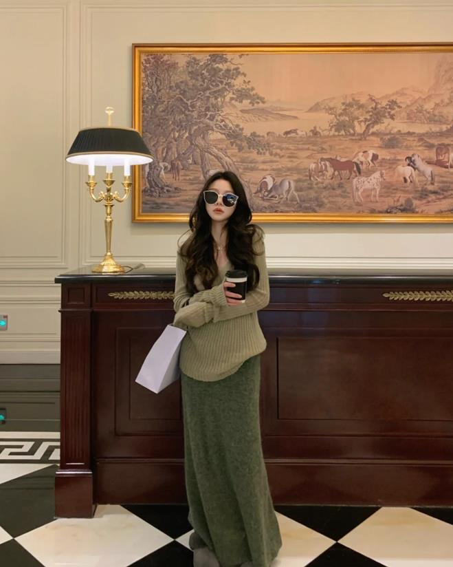 文藝又時髦的一套,同色系的組合,但有一定的色差,因此整體組合在一起,就很不失層次,苔蘚綠的毛衣和裙子,都是寬鬆的版型,這麼組合在一起,有種很慵懶的調調,也還不失高級。