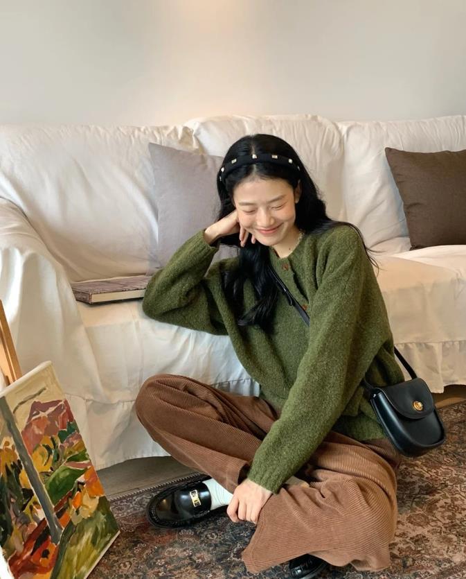 復古又充滿慵懶的苔蘚綠,這個色調的飽和度並不是太高,綠棕的配色,真的蠻耐看的,入秋後,像針織衫、毛衣開衫都是必備款,與棕色的長褲相配,整個風格充滿了復古氣息,韓系範十足。