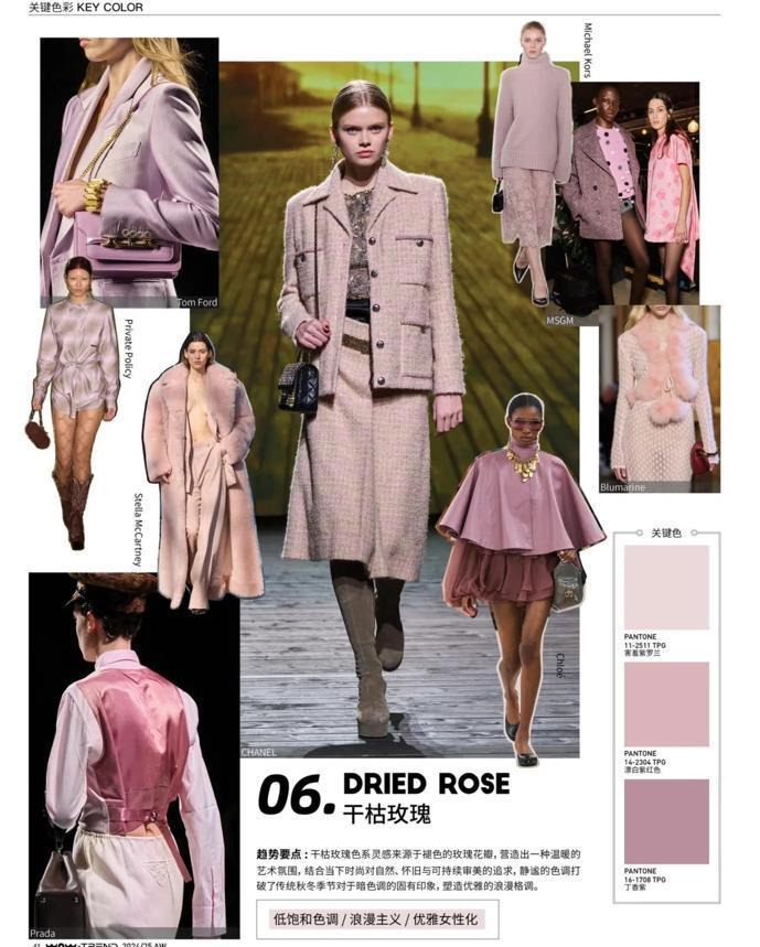 乾枯玫瑰色,也是今年入秋很流行的顏色之一,這種是源於褪色的玫瑰花瓣,再結合當下時尚,對自然、懷舊持續審美的追求,靜謐的色調打破了傳統,從而塑造出優雅浪漫的格調。