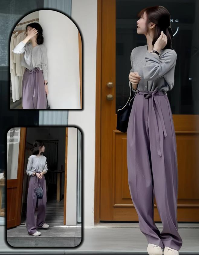 簡約又幹淨的配色穿搭,不管在哪個季節都是很合適的,入秋後,一定要試試耐久灰,低飽和度的顏色,就是非常百搭,上衣的版型是寬鬆的,完全不挑人,搭配起一條紫色休閒西裝褲,蠻韓範的一套,少女既視感滿滿。