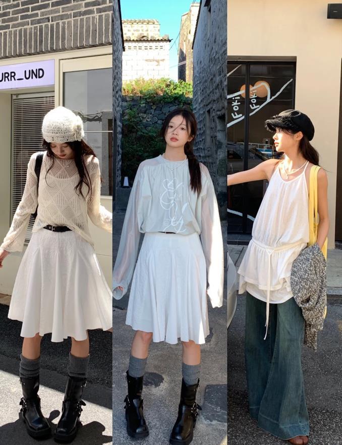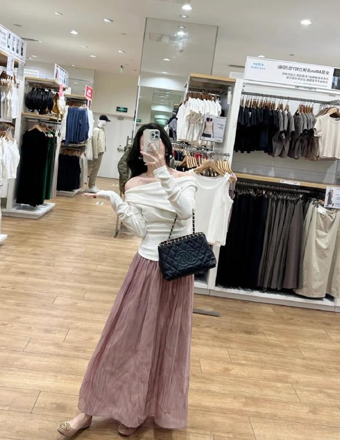 這一套看起來有點仙啊,白色一字肩上衣+乾枯玫瑰粉半身長裙,對於這種粉粉嫩嫩的裙子,真的太減齡了,整個穿搭透着慵懶的調調,很舒適和溫柔,不管是在上班,還是去逛街約會,都適合穿。