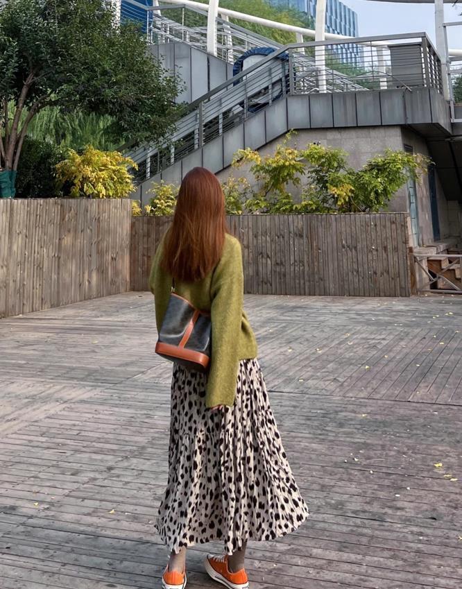 毛茸茸的苔蘚綠毛衣,穿起來實在是太顯白了,與豹紋半身長裙相配,真的太搭了,遵循了一簡一繁的組合,不僅顯層次,還很時髦好看。腳下踩着的橘色帆布鞋,輕鬆點綴了整個着裝,可太吸睛了。