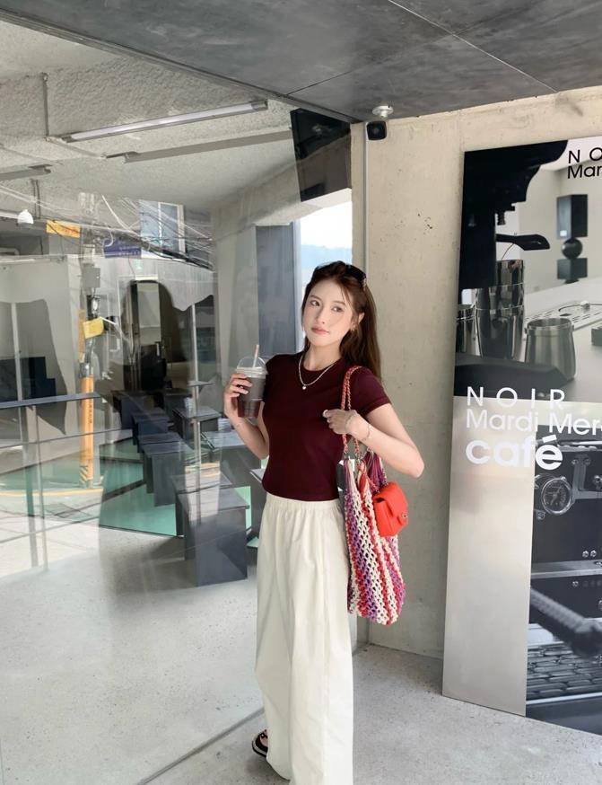 安可拉紅色真的非常顯白啊,很喜歡這種簡簡單單的穿搭,基礎款短袖t恤,不僅百搭時髦還耐看,選擇一條白色的休閒長褲來配,上短下長的組合,實在是太修飾身材了,輕鬆就能打造出高挑感。