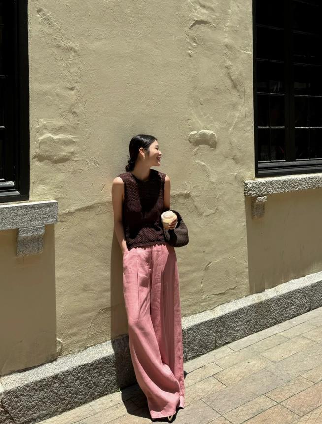 慵懶又充滿復古風的一套穿搭,法式鏤空背心,這個顏色真的很充滿復古氣息,也很百搭,搭配乾枯玫瑰色的休閒闊腿褲,這種寬鬆的褲型,對腿粗、下身胖的身材可太友好了,喜歡這種鬆弛感、老錢風的穿搭,就學起來吧!