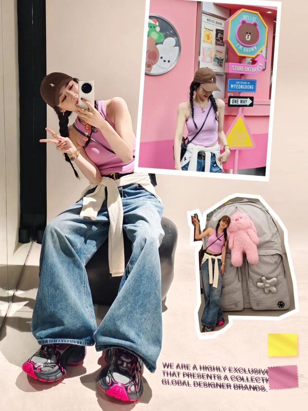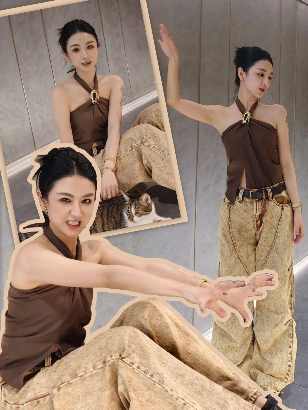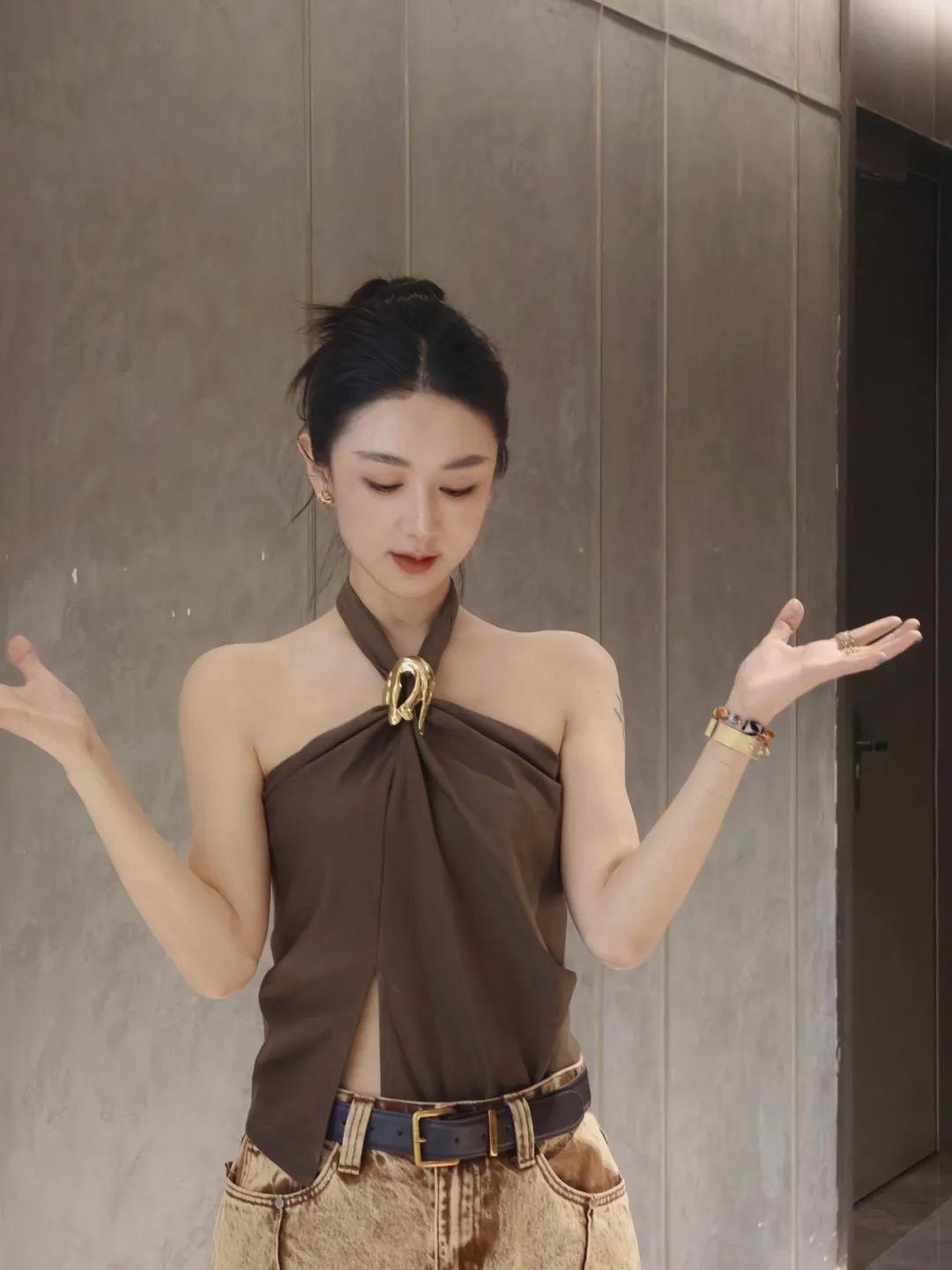 掛脖吊帶+黃銅釦的組合看似有些“隆重”?混搭一條水洗做舊的闊腿牛仔褲,立刻就有了“City walk”的時髦休閒感。