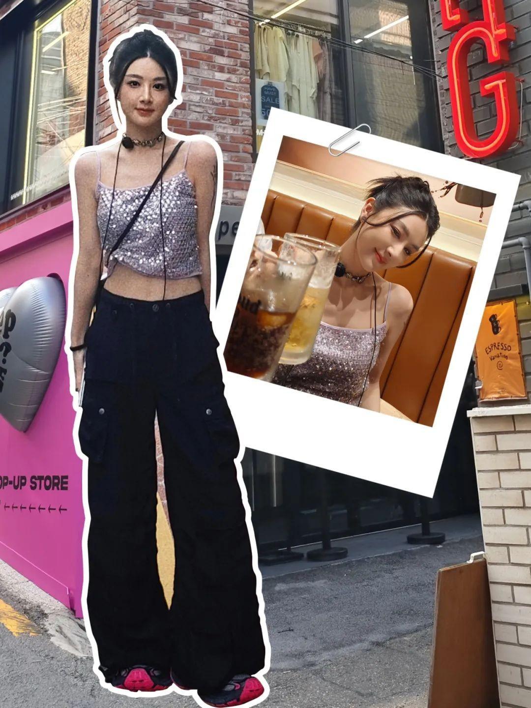 基礎的黑色作爲穿搭裏的“萬金油”,可以搭配一件吸睛的亮片背心,讓整體色調變得活躍起來。