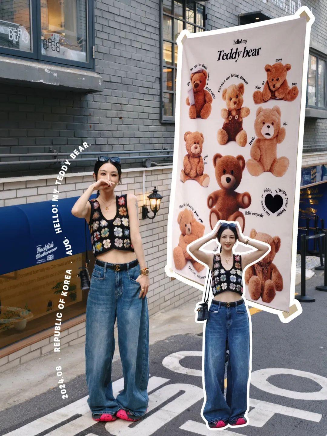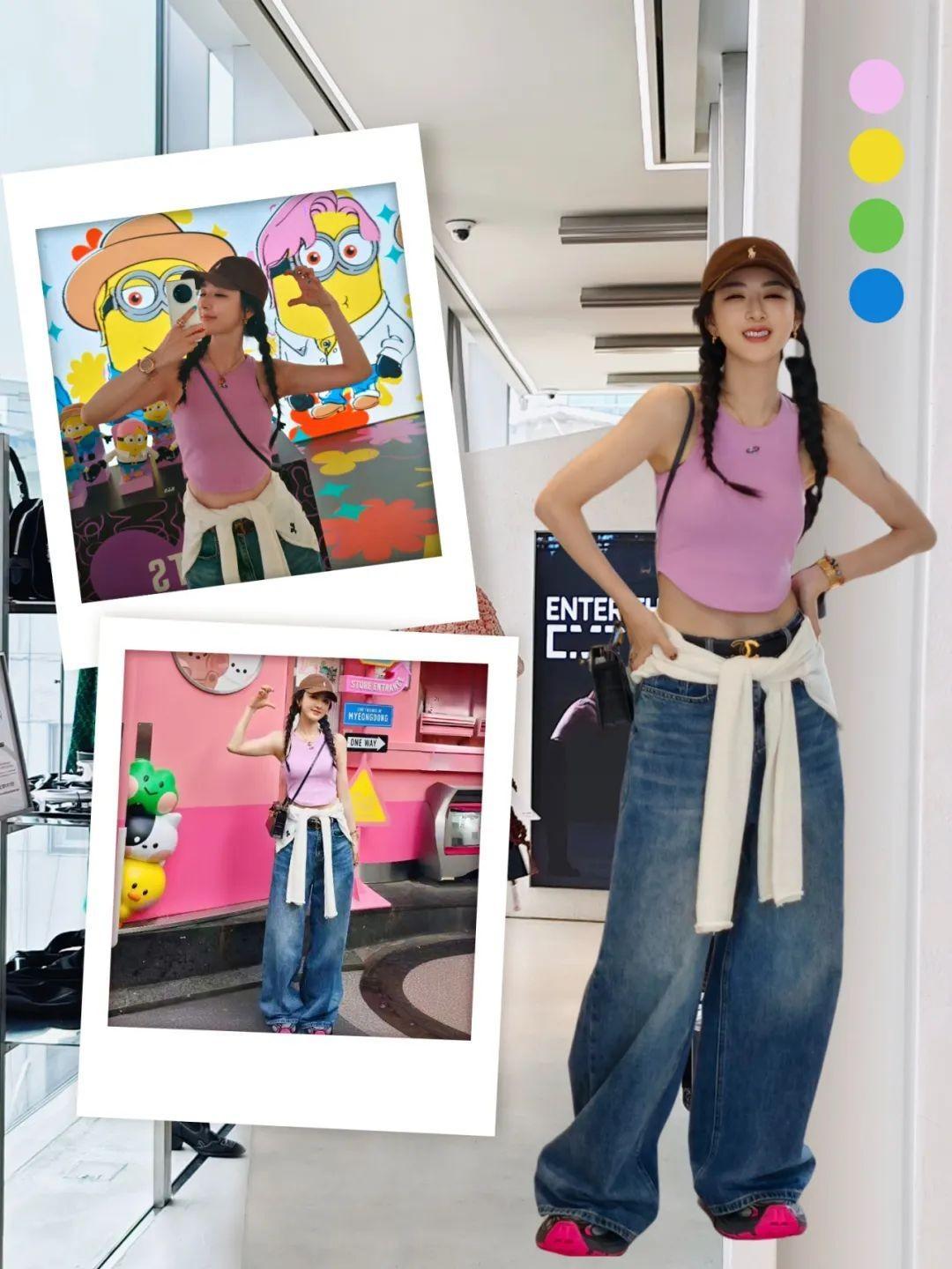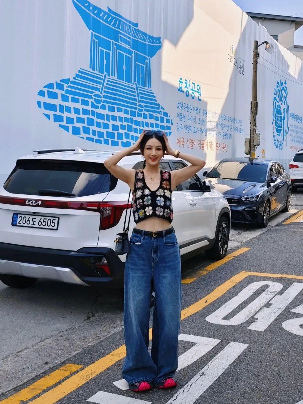 緊身但又兼顧時髦度的簡約小背心,搭配闊腿垂感藍色牛仔褲,上緊下松,輕鬆穿出好比例。