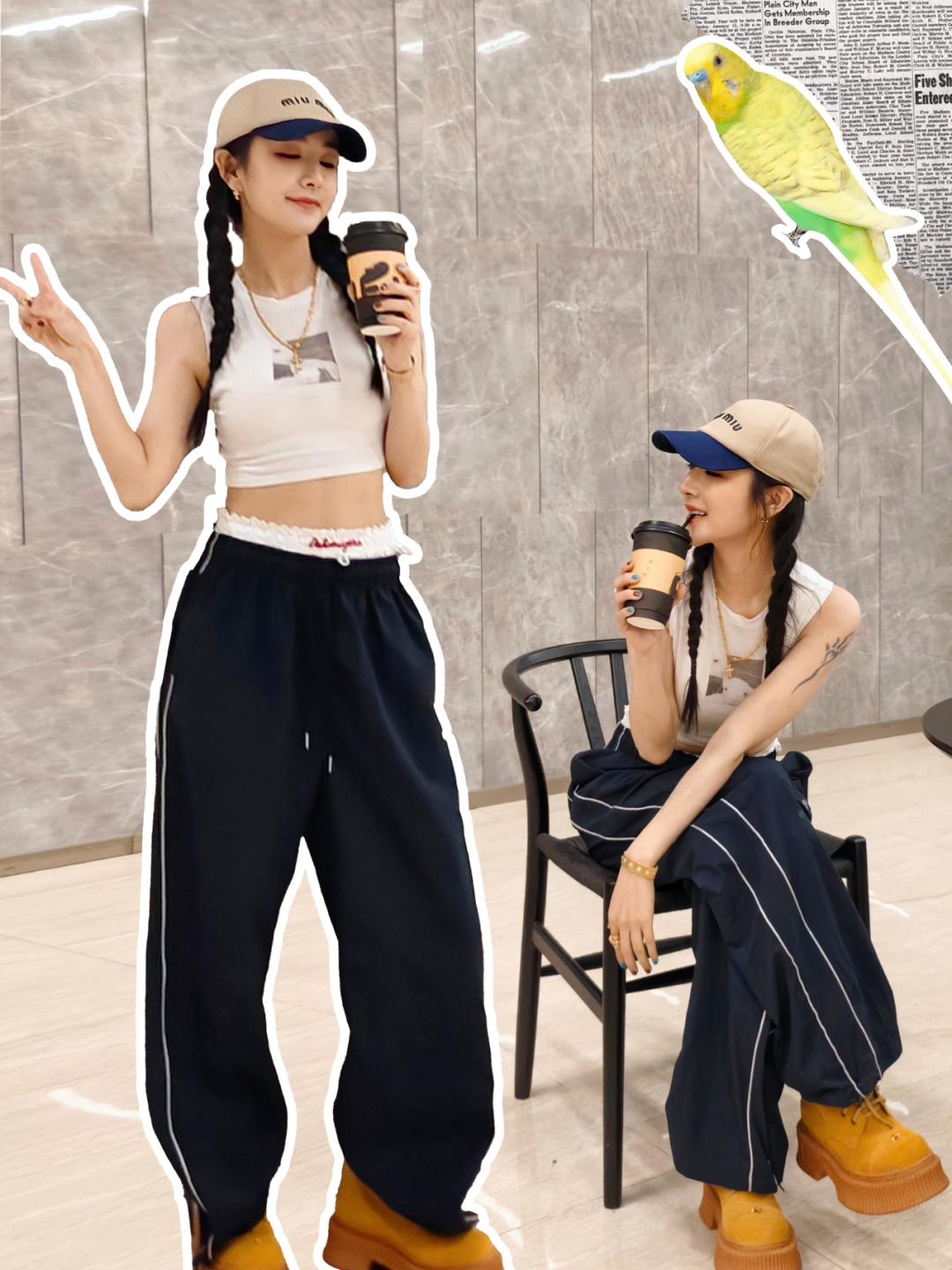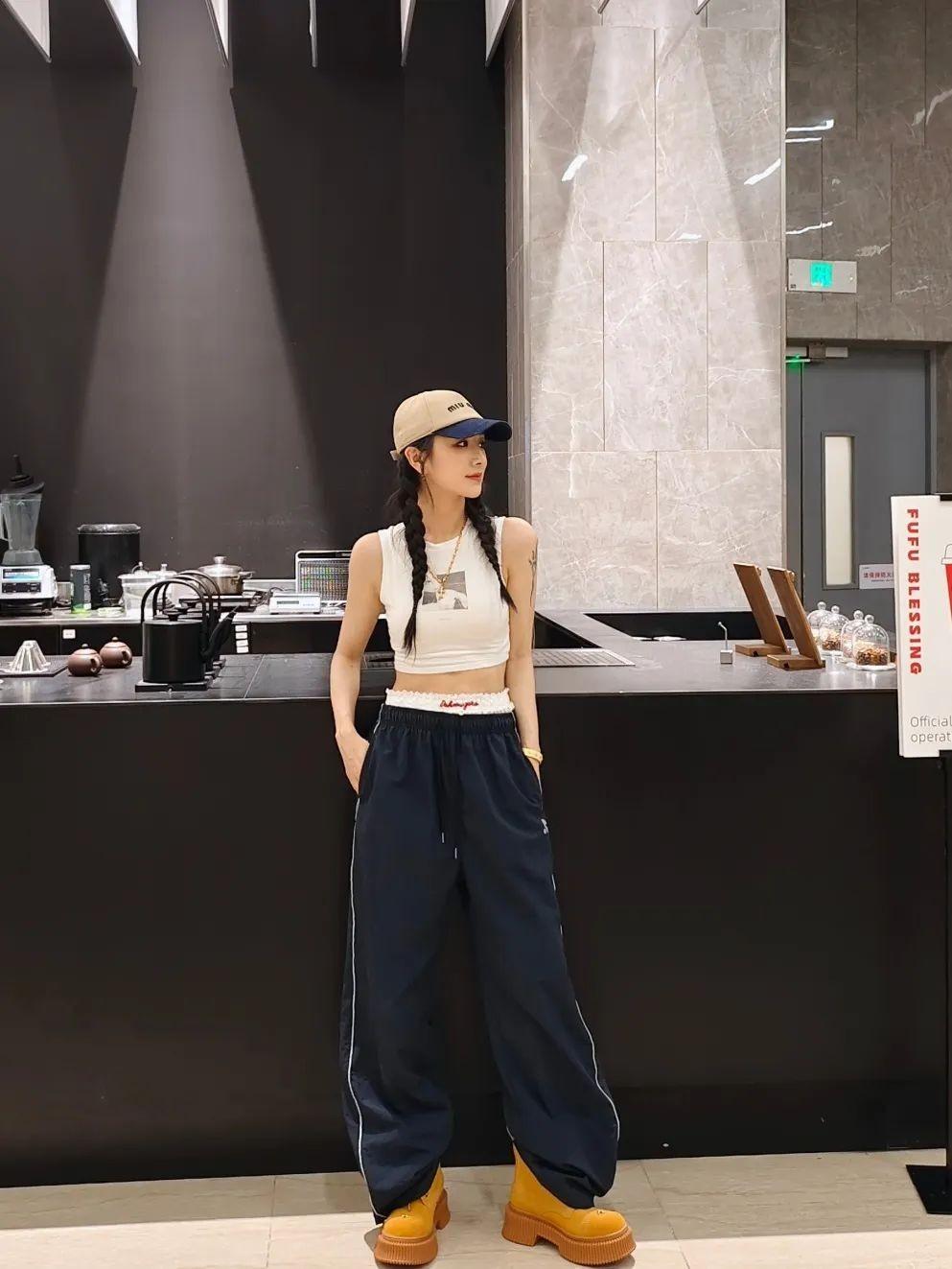 帽檐與長褲配色呼應,白色背心與褲邊配色呼應。麂皮的黃色休閒短靴,看似被長褲漫不經心的覆蓋,實則透露着一股慵懶的鬆弛感和恰到好處的酷勁兒。