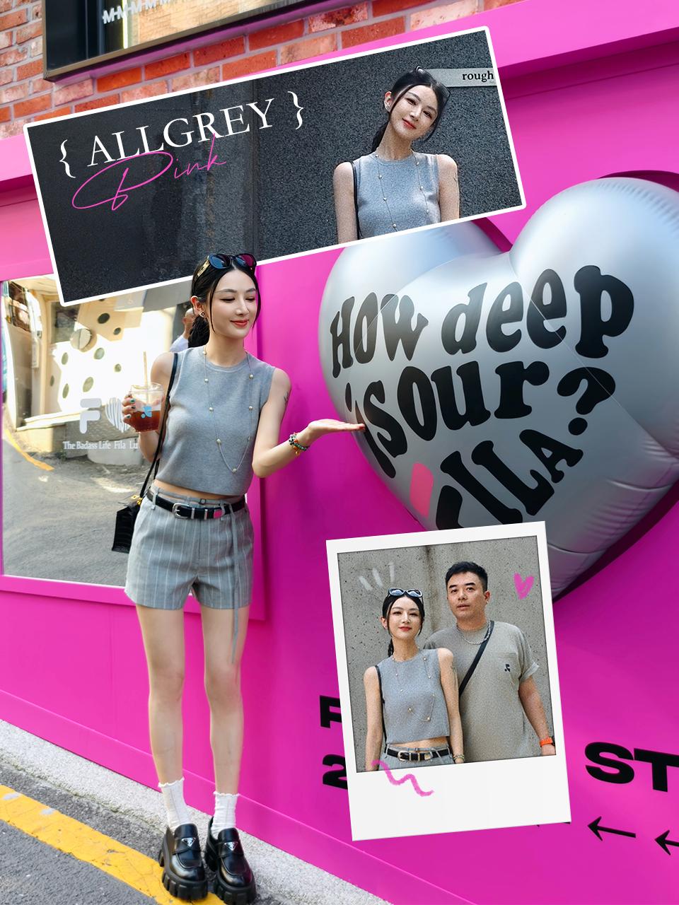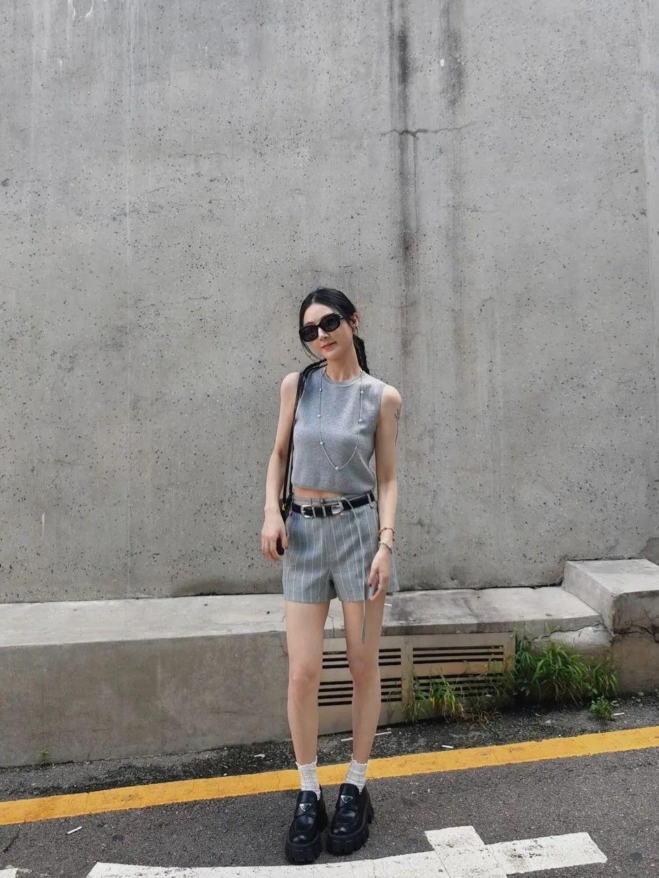 灰卡搭配,背心、包包與鞋子的相呼應,很適合城市中閒逛和乾淨利落的日常穿搭。
