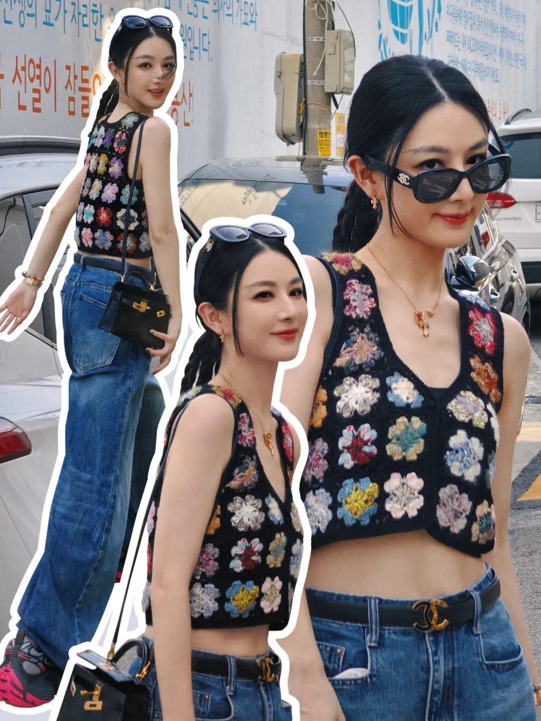 粗針織小馬甲+同色調的隱形抹胸搭配,復古的小花元素用現代的方式呈現,視覺上靈動又充滿活力。