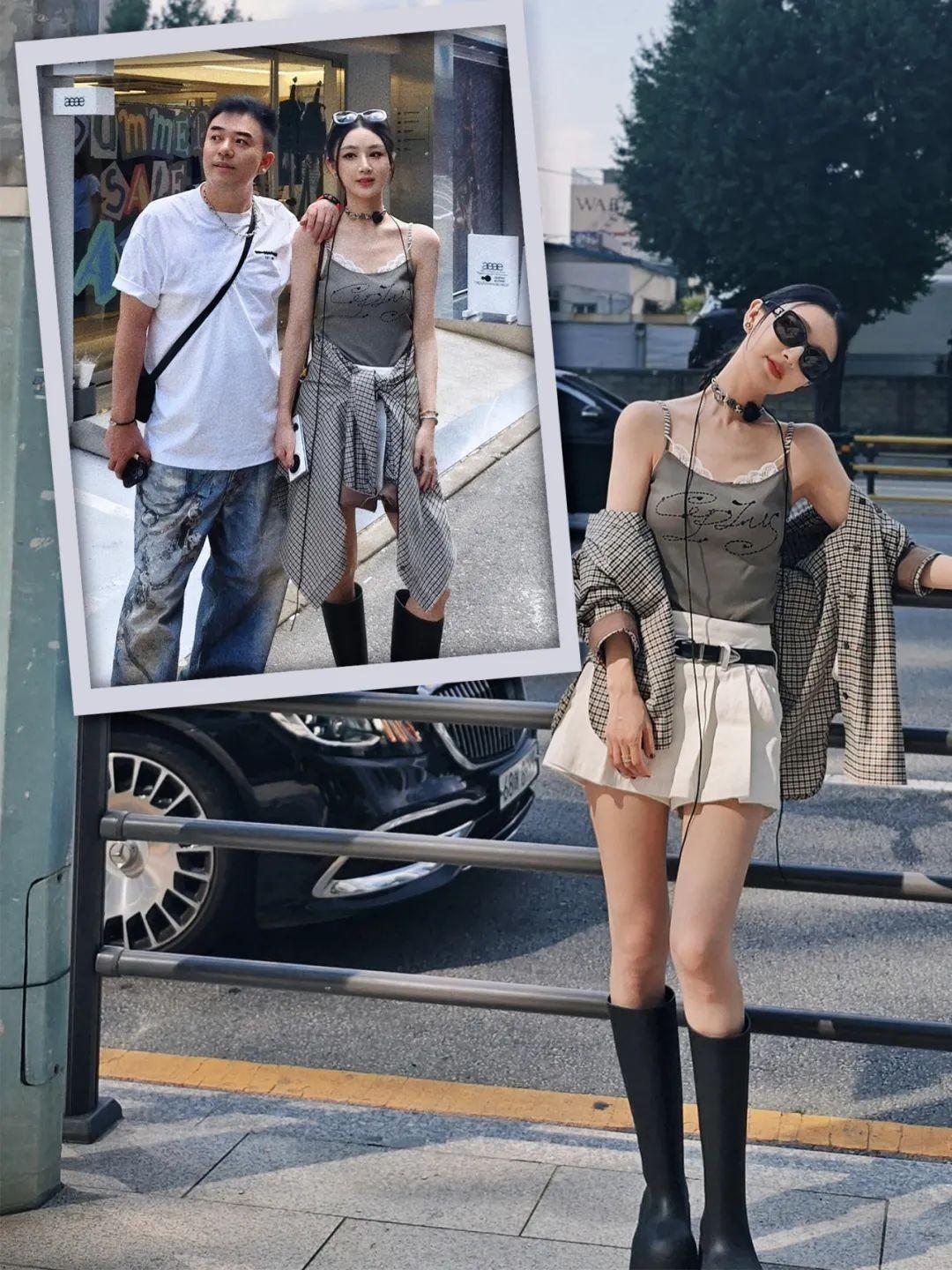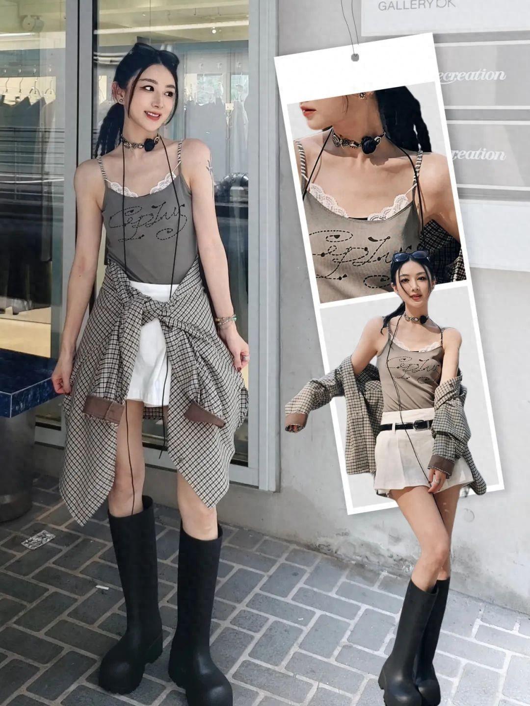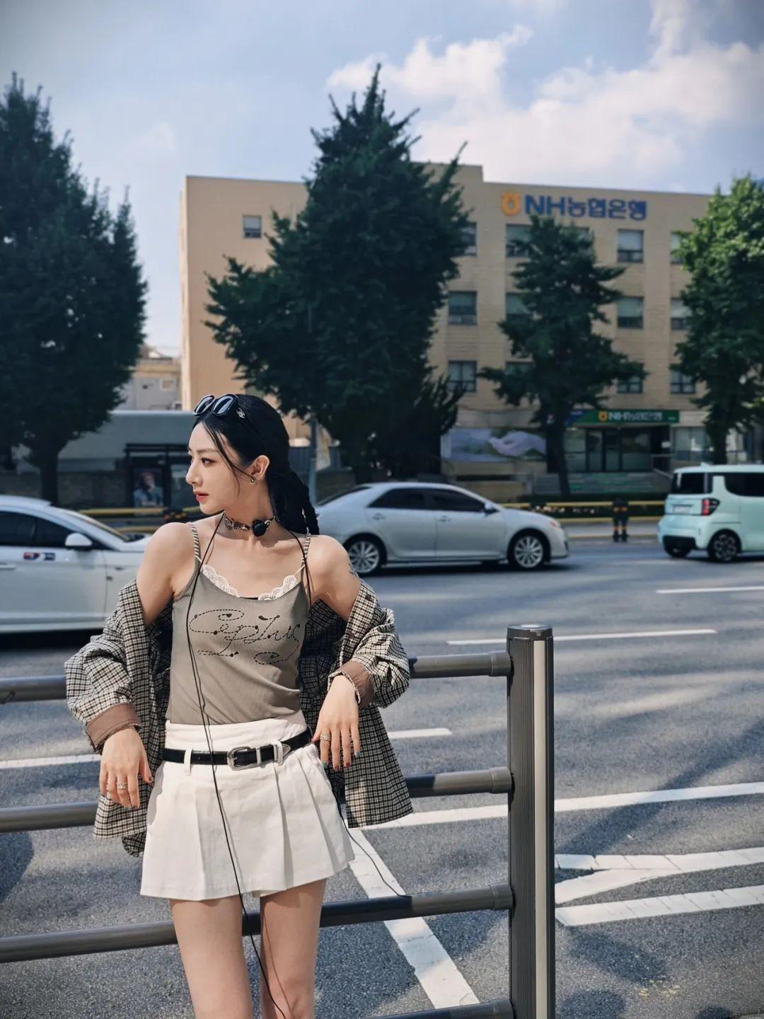 假兩件的蕾絲邊背心,搭配垂感廓形格子外套,出門在外,給穿搭拍照就是要有層次感!