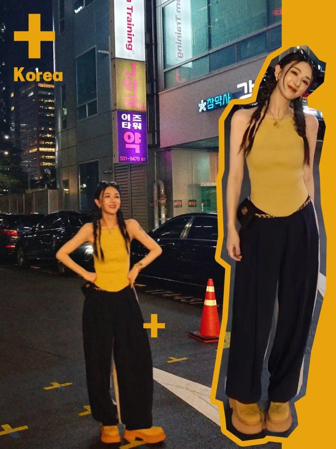 低調的暗黃色背心與深藍色長褲相搭,中間可以繫上一個小號的鏈條包包,或者細腰帶來更加凸顯腰線,顏色可選擇例如和背心鞋子相呼應的配色,這樣也不會顯得突兀,看起來很舒服。