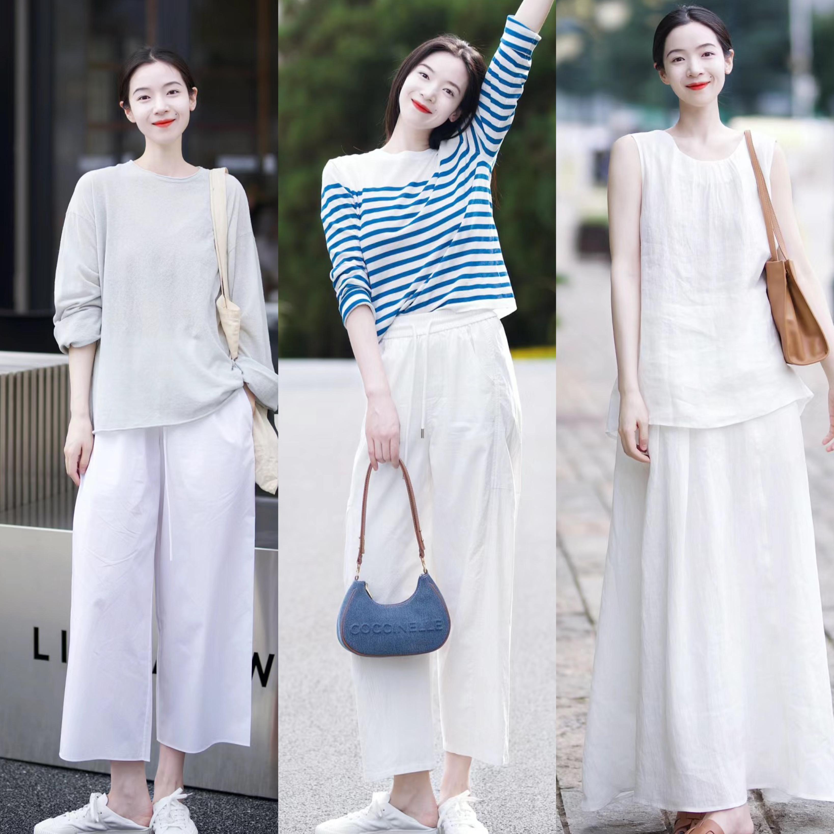 尤其是白色闊腿褲,可以讓我們的穿搭更從容優雅。白色闊腿褲,可以配九分褲、或者及地褲的款式。九分闊腿褲更清爽,及地闊腿褲更大方。