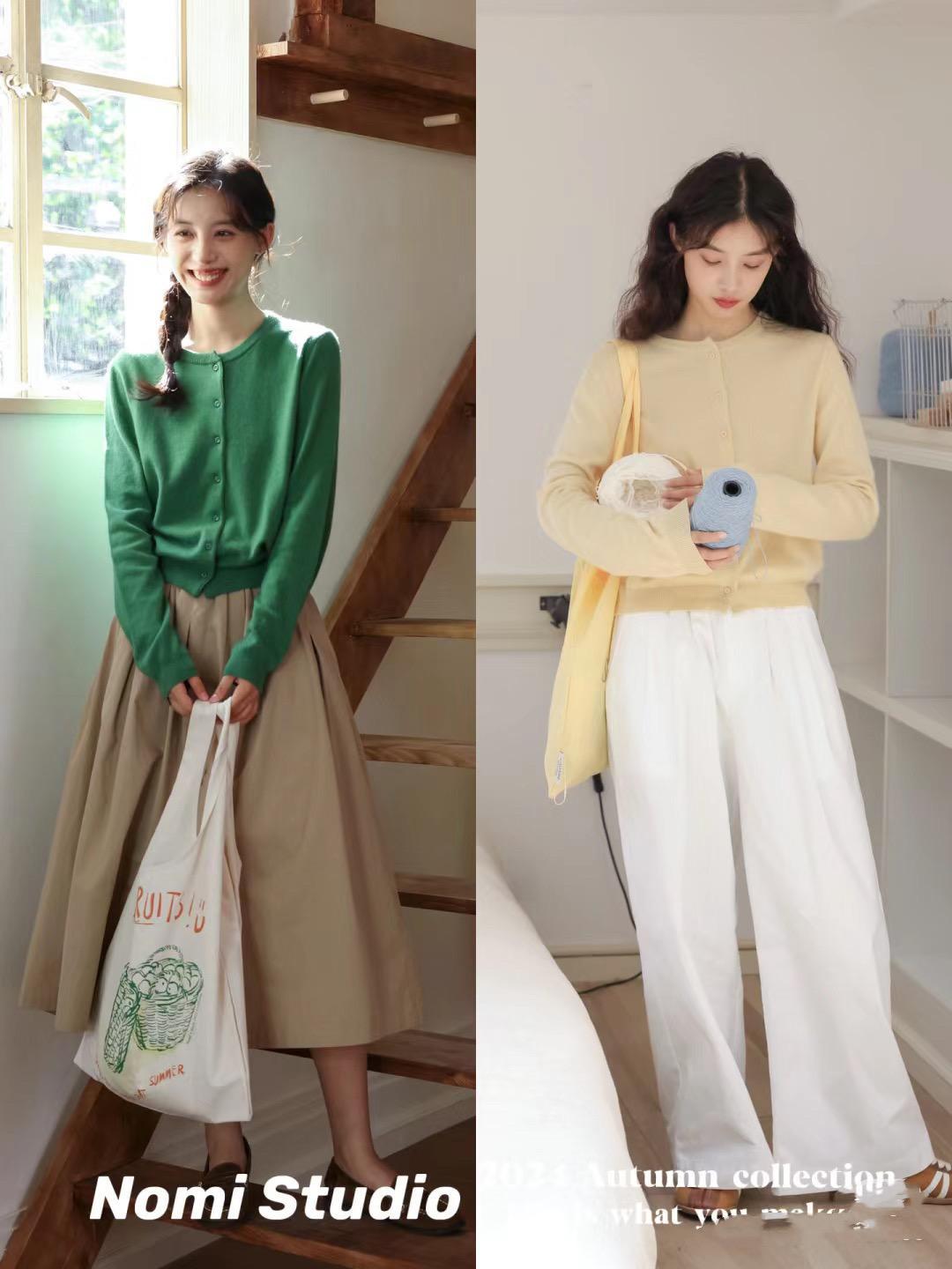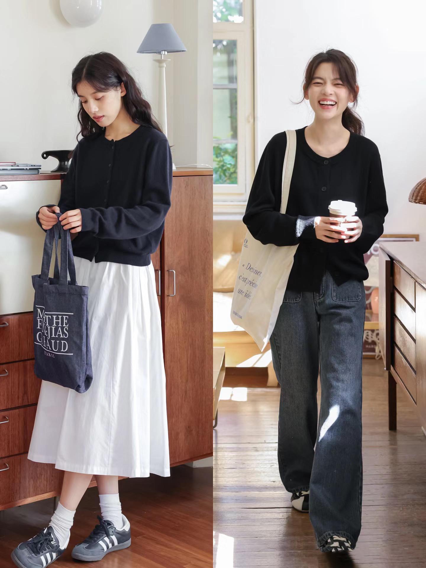 針織開衫可以配高腰的半身裙/直筒褲,針織開衫配白色傘裙,或者黑色牛仔褲,都屬於大方又耐看的組合。黑白配更醒目,一身黑色更大方顯瘦。