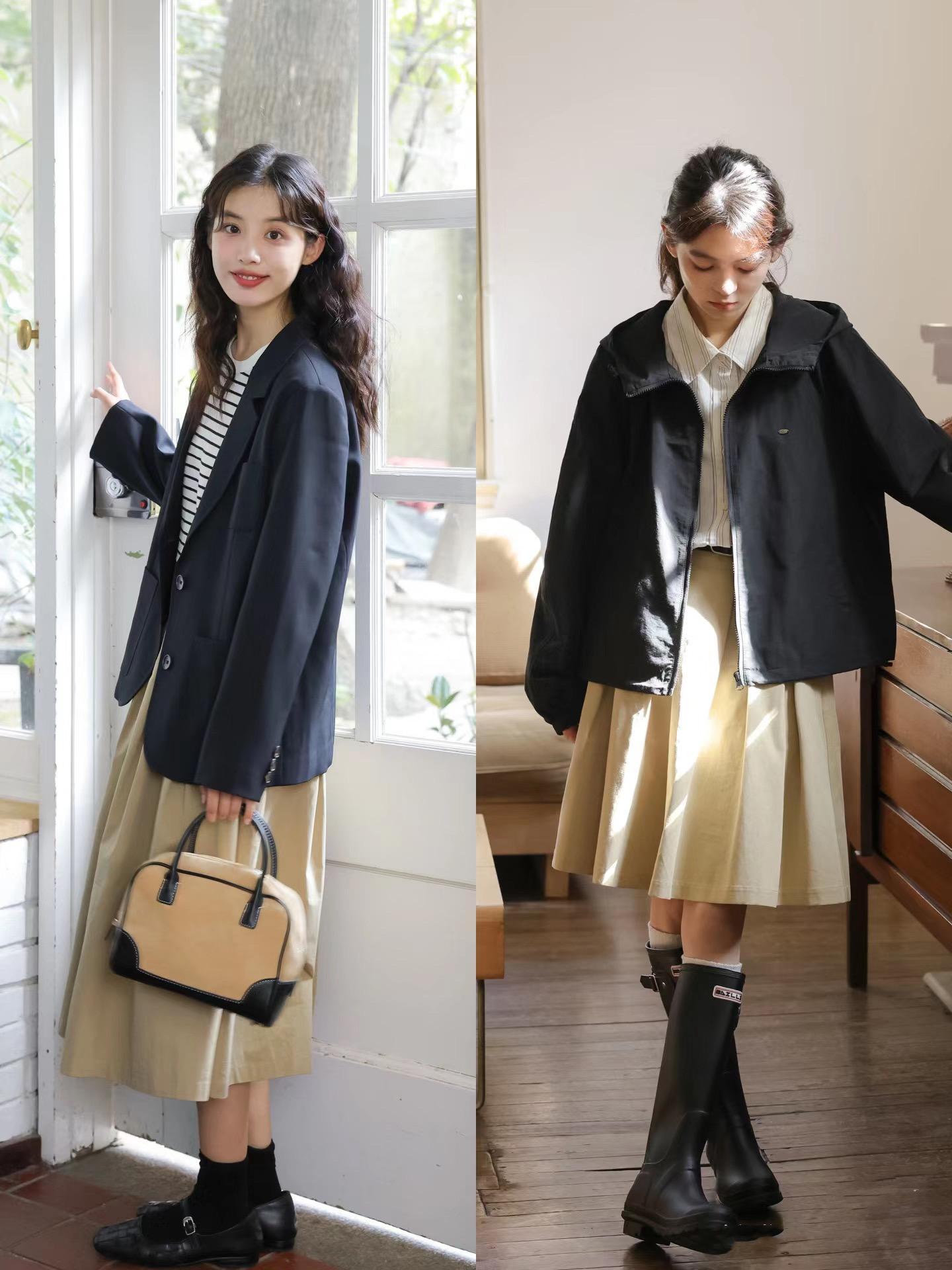 皮衣外套+白色T恤+傘裙,就屬於一種可甜可鹹的搭配。鹹菜色的皮衣外套+白色T恤+卡其色傘裙,既溫柔又灑脫,讓小個子女生的穿搭可塑性更強。