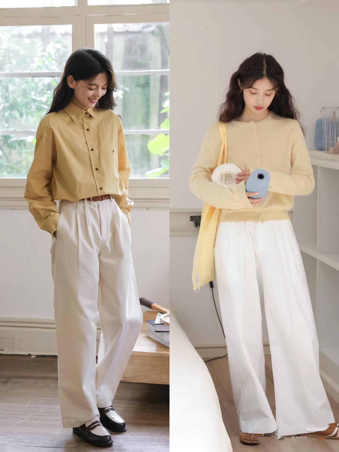 鵝黃色襯衫/針織衫+白色直筒褲