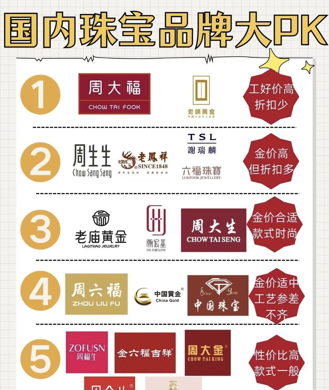 第四梯隊:週六福、中國黃金、中國珠寶,金價沒那麼高,相對價格適中,而工藝參差不齊,所以在選款的時候,需要格外細心的挑選一下。