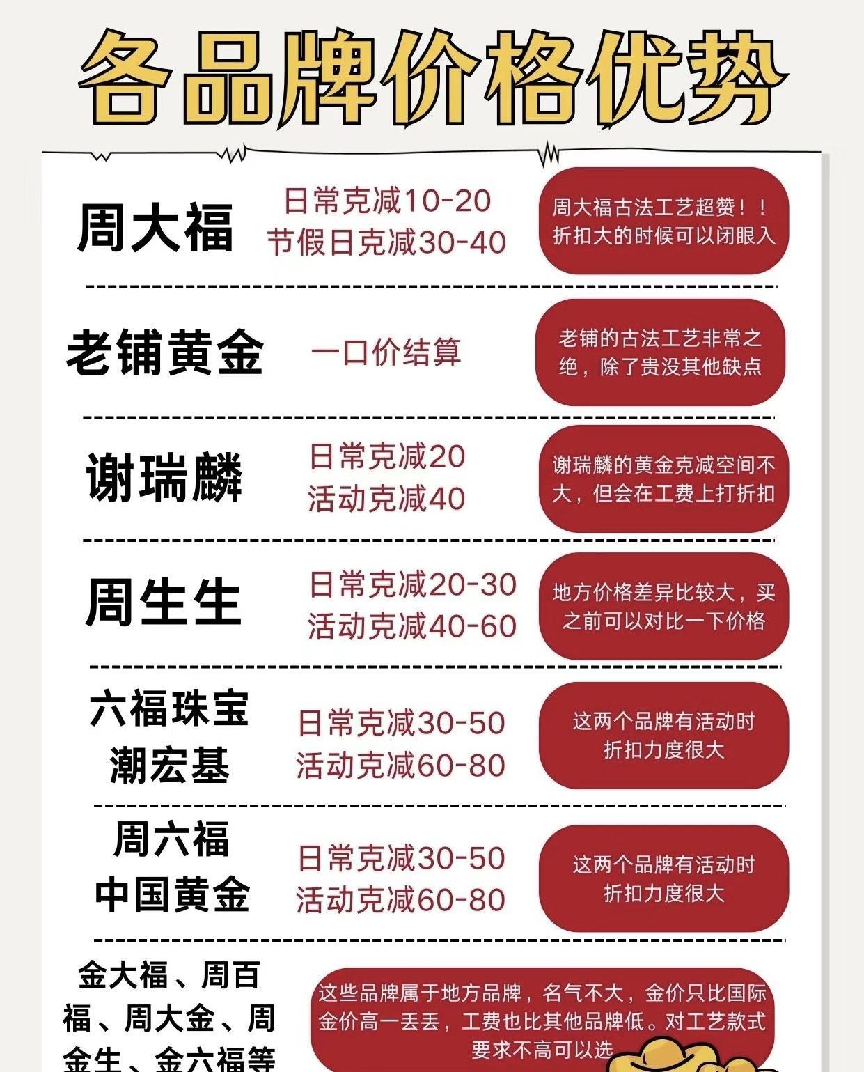 六福珠寶、潮宏基,週六福、中國黃金,活動力度比較大,日常克減30-50,活動克減60-80,有活動的時候,折扣力度相對比較大。