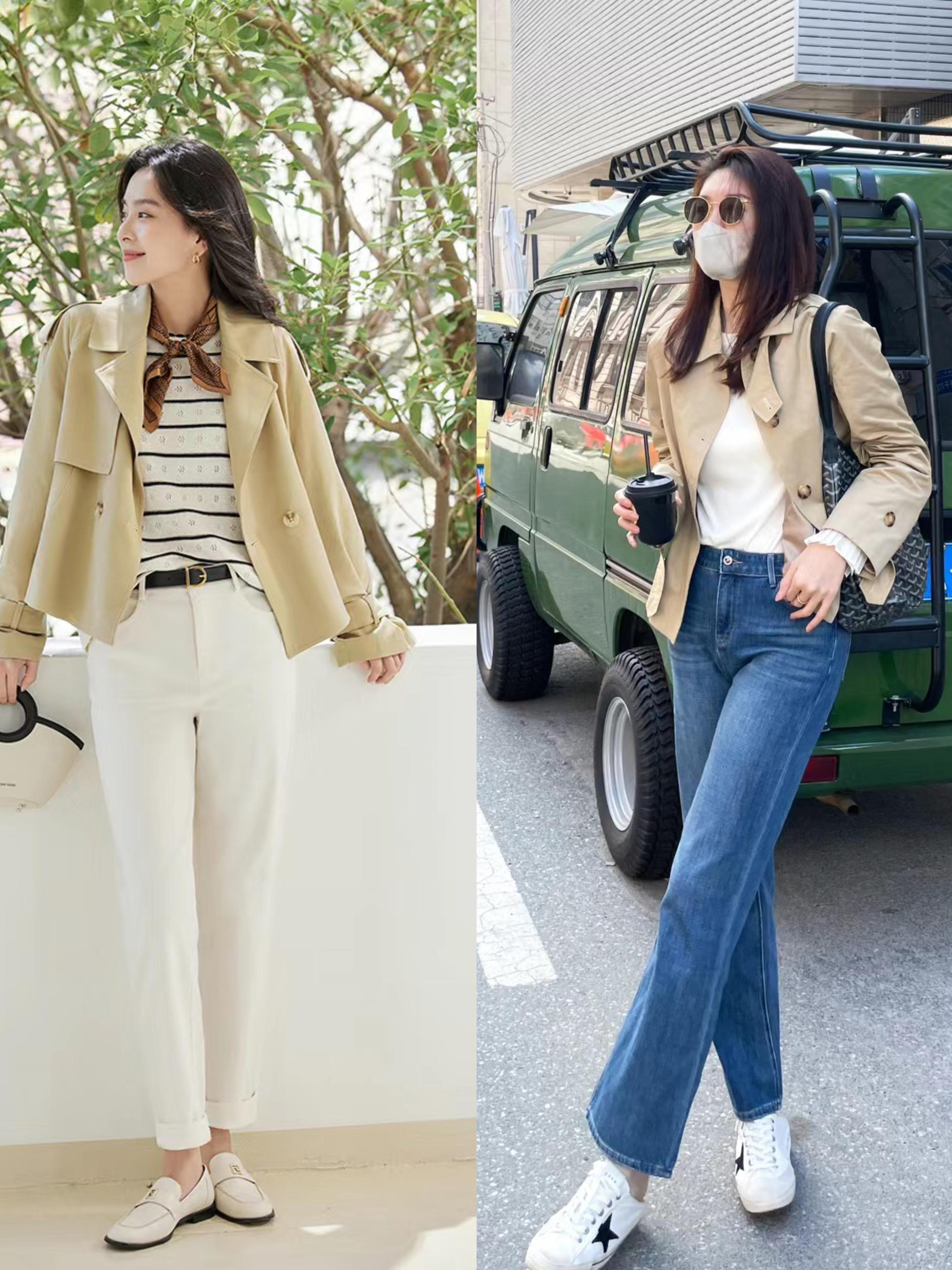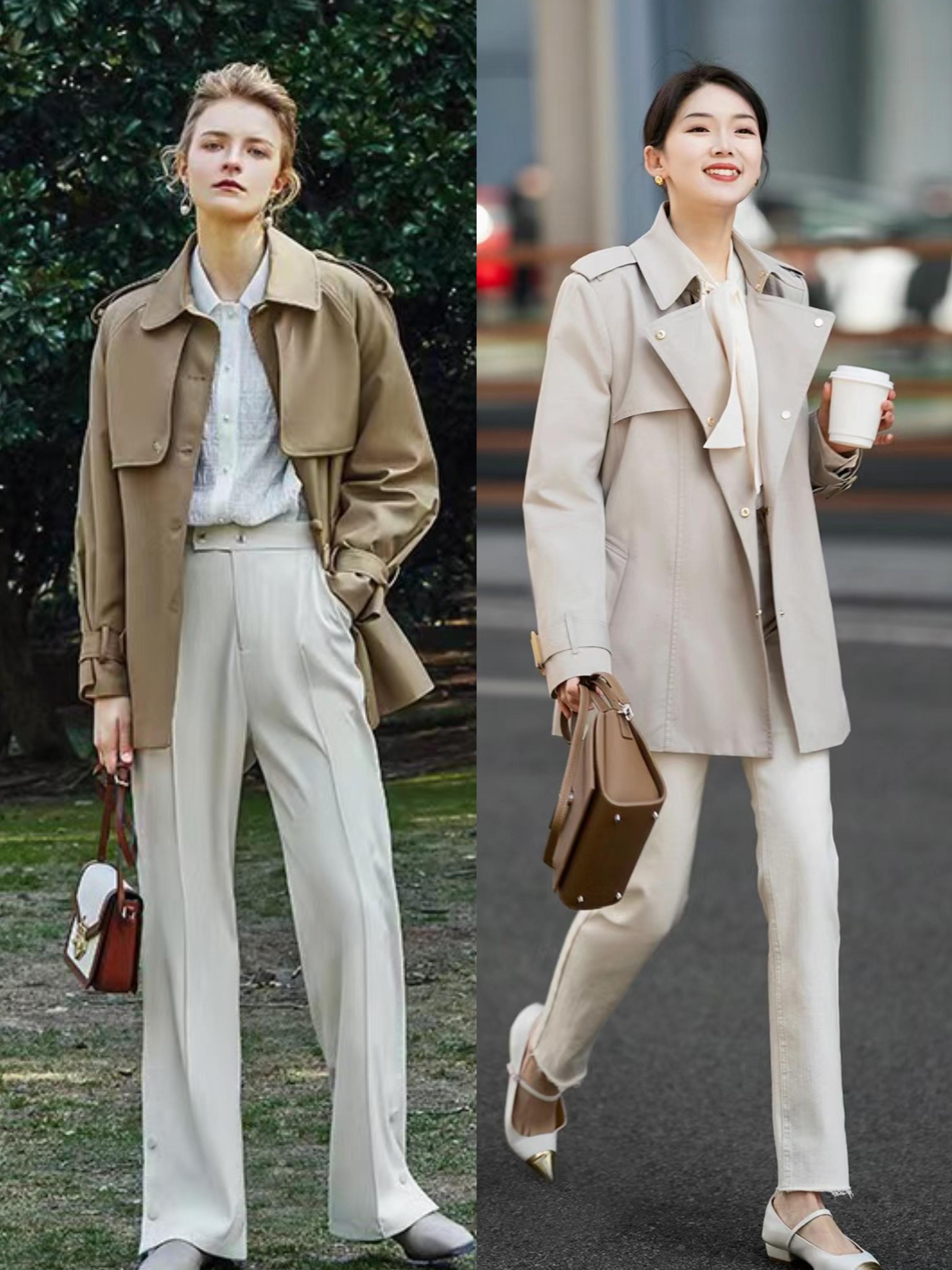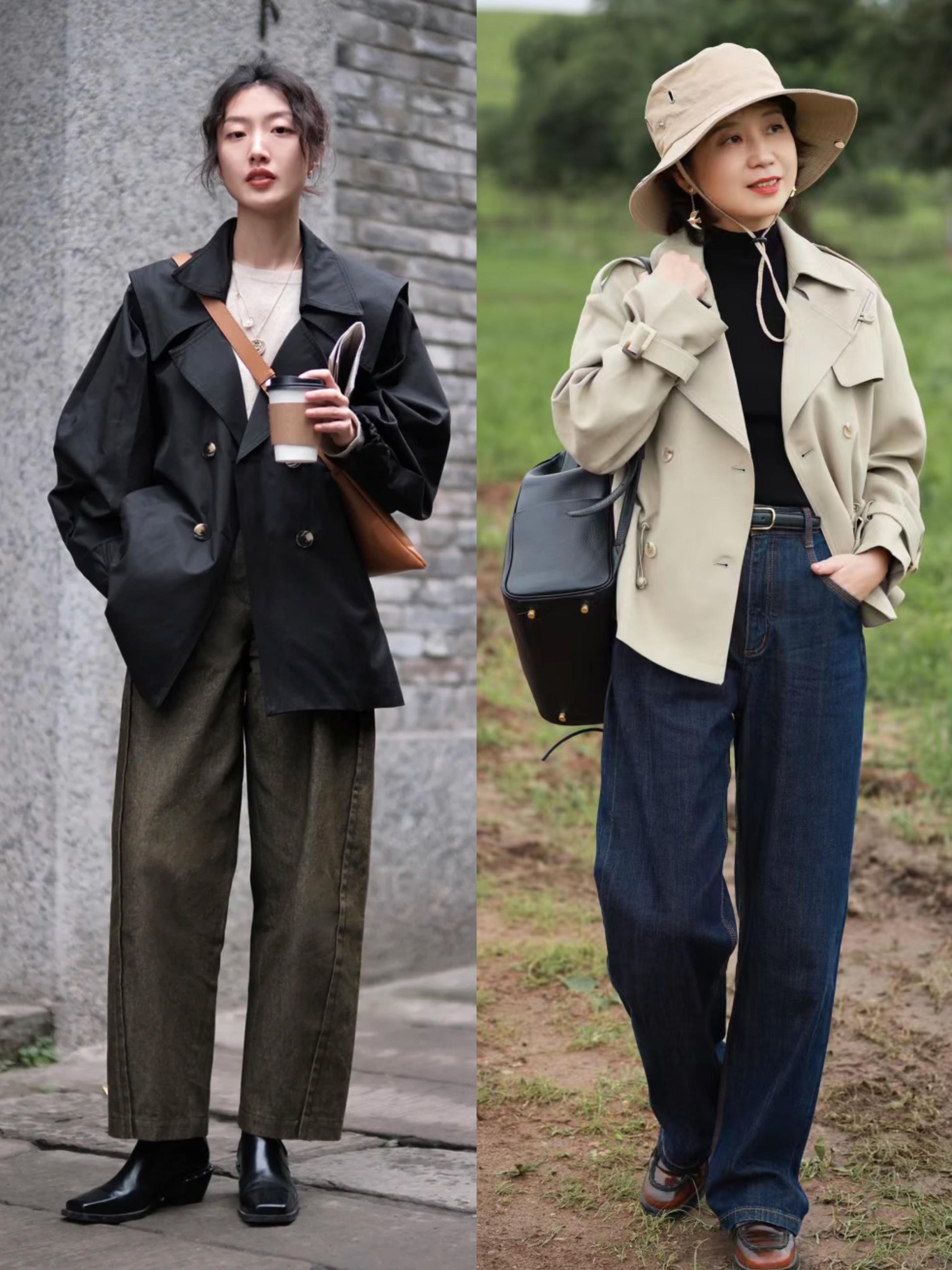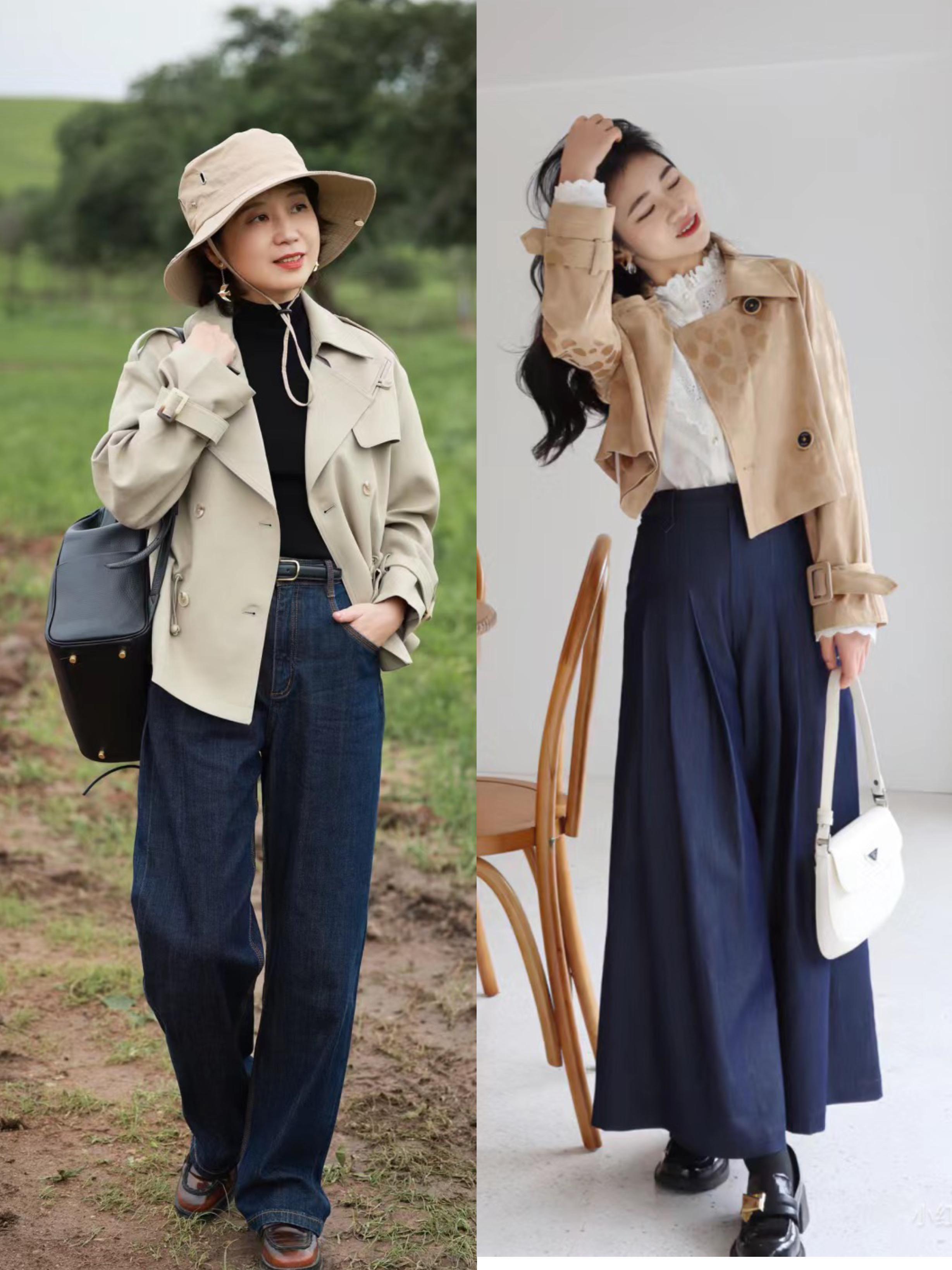 如果你個子不高,身材也沒那麼苗條,就比較建議選擇短風衣+闊腿褲的組合了,休閒隨性、又大方顯瘦。
