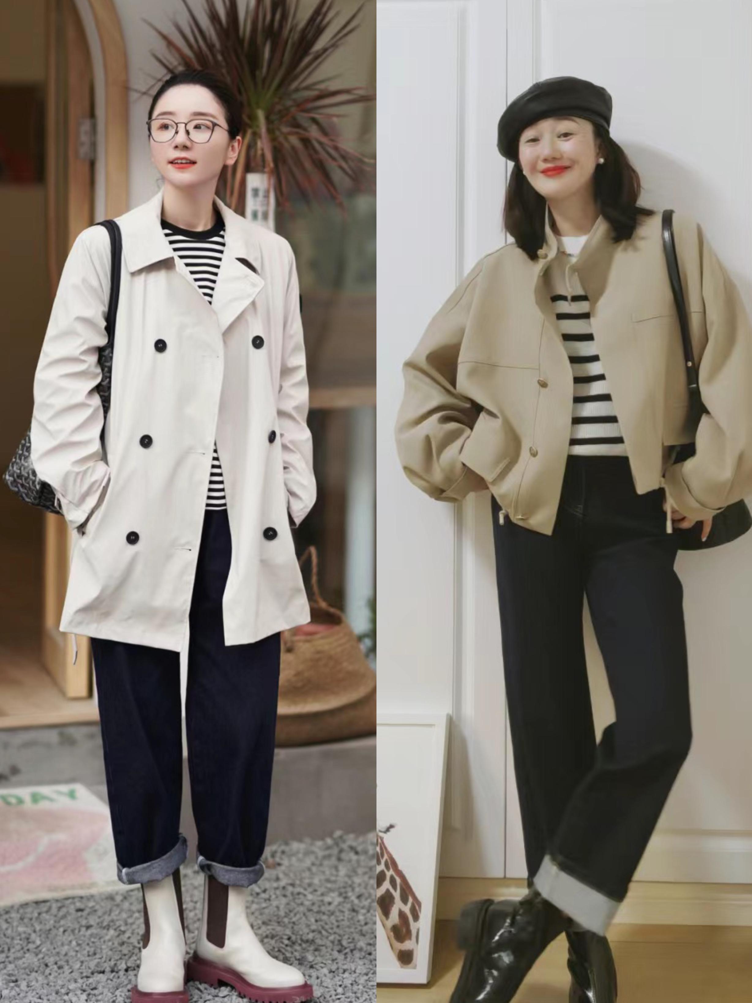 不管是米白色、卡其色還是黑色,都更適合於短風衣來搭配。短風衣可以配條紋打底衫、也可以配T恤或者襯衫,舒適還耐看。