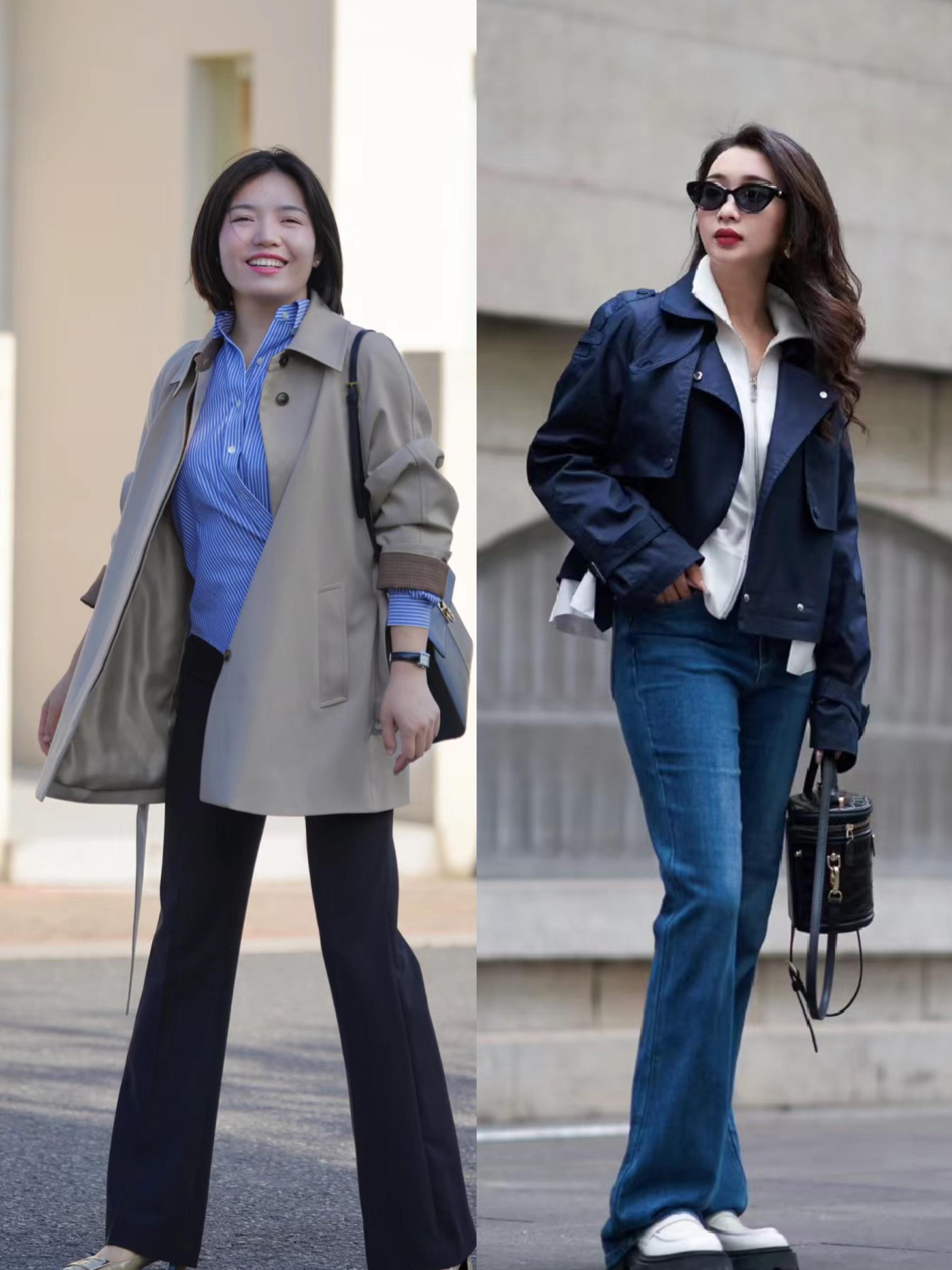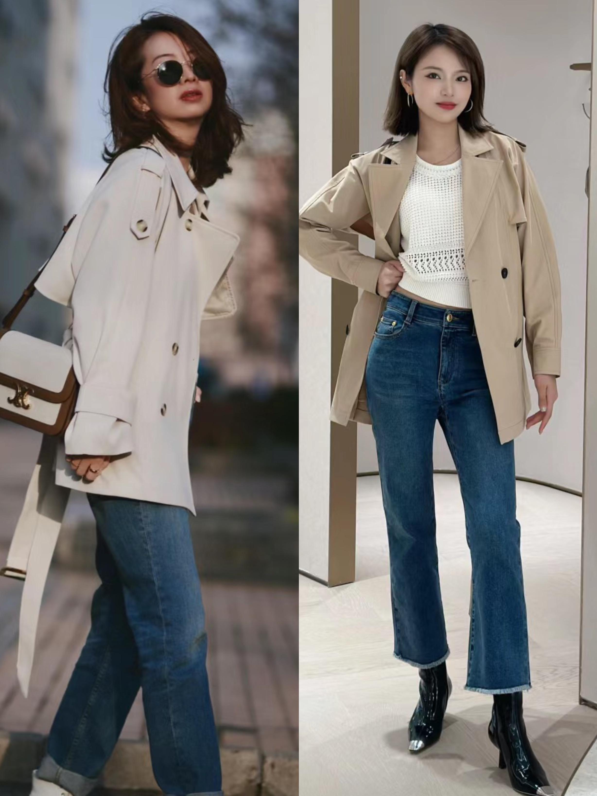 簡單清爽、百看不膩的一種穿搭組合。當你穿衣搭配沒有思路和靈感的時候,就選擇短風衣配微喇牛仔褲吧。