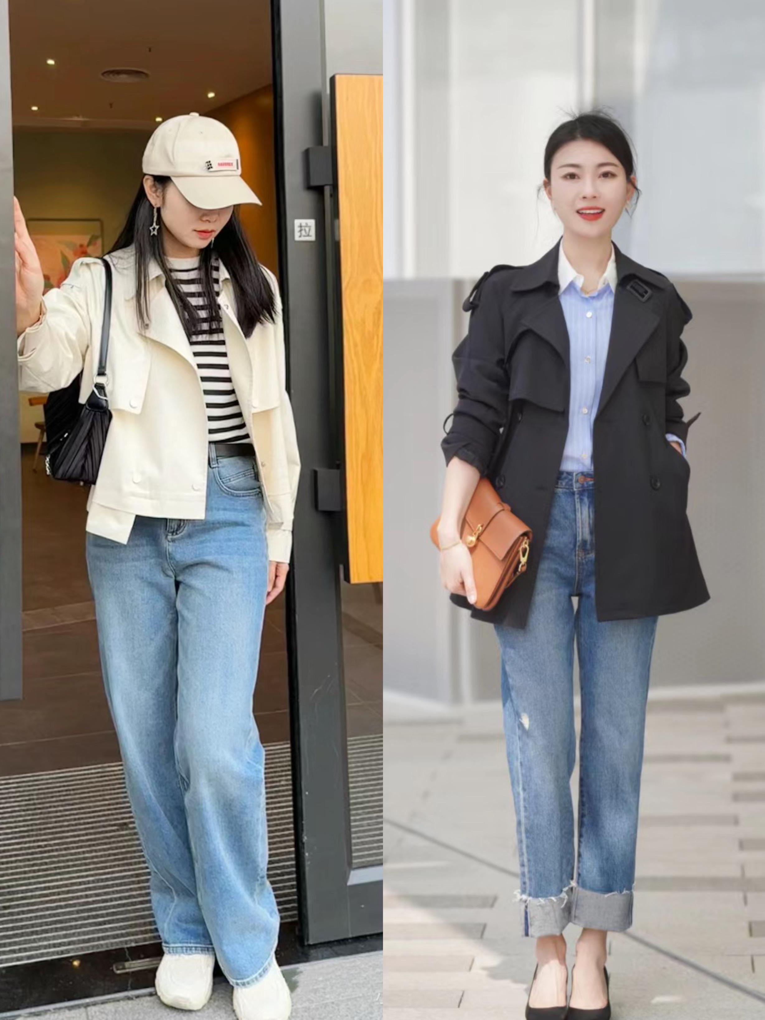 一組最簡單大氣、且不挑人的穿搭模版。短款風衣,與之痛的牛仔褲更配。過腰遮胯的短風衣,配上直筒的牛仔褲,鬆弛又體面。