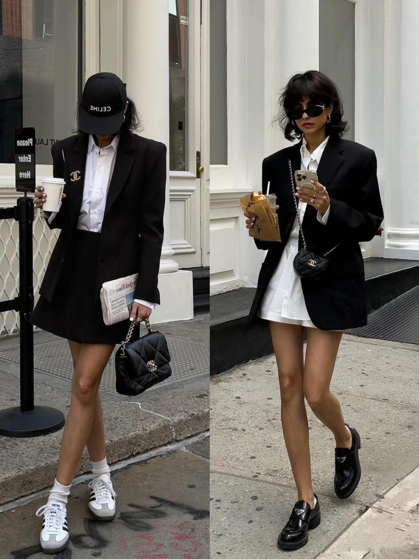 就像黑色的西服外套+白襯衫,鏈條包、金色耳環的點綴,讓英氣感穿搭更顯貴。金色耳環+黑色西服,也演繹着休閒酷颯的英氣名媛風。