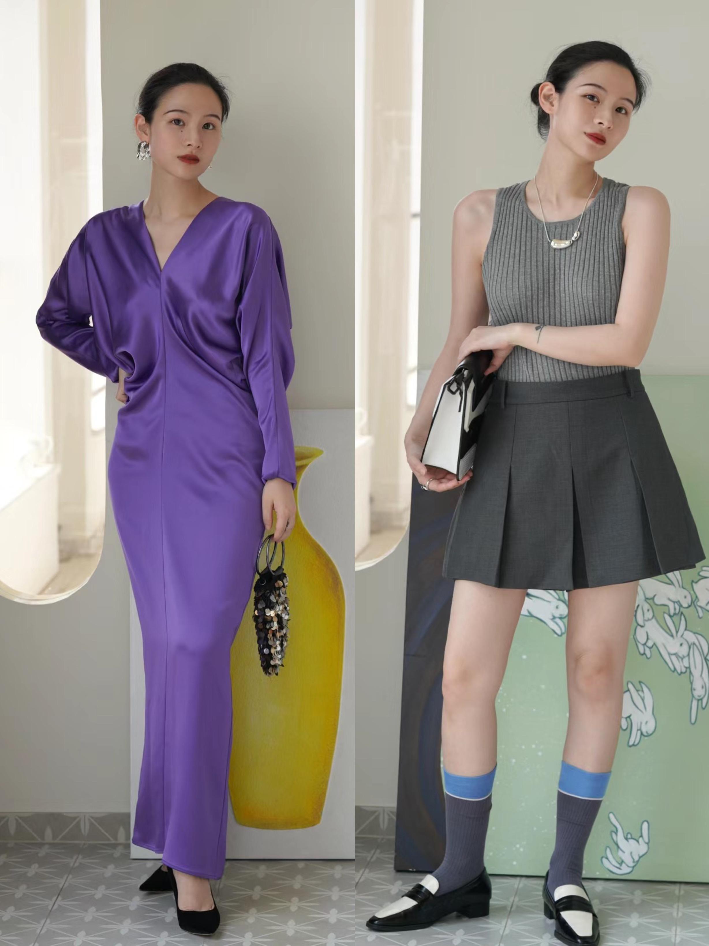 偶爾想要出席正式場合,這種優雅又顯貴的穿搭就可以派上用場了。一條紫色系的緞面連衣裙,配黑色尖頭高跟鞋,滿是英氣名媛風的華貴與大方。