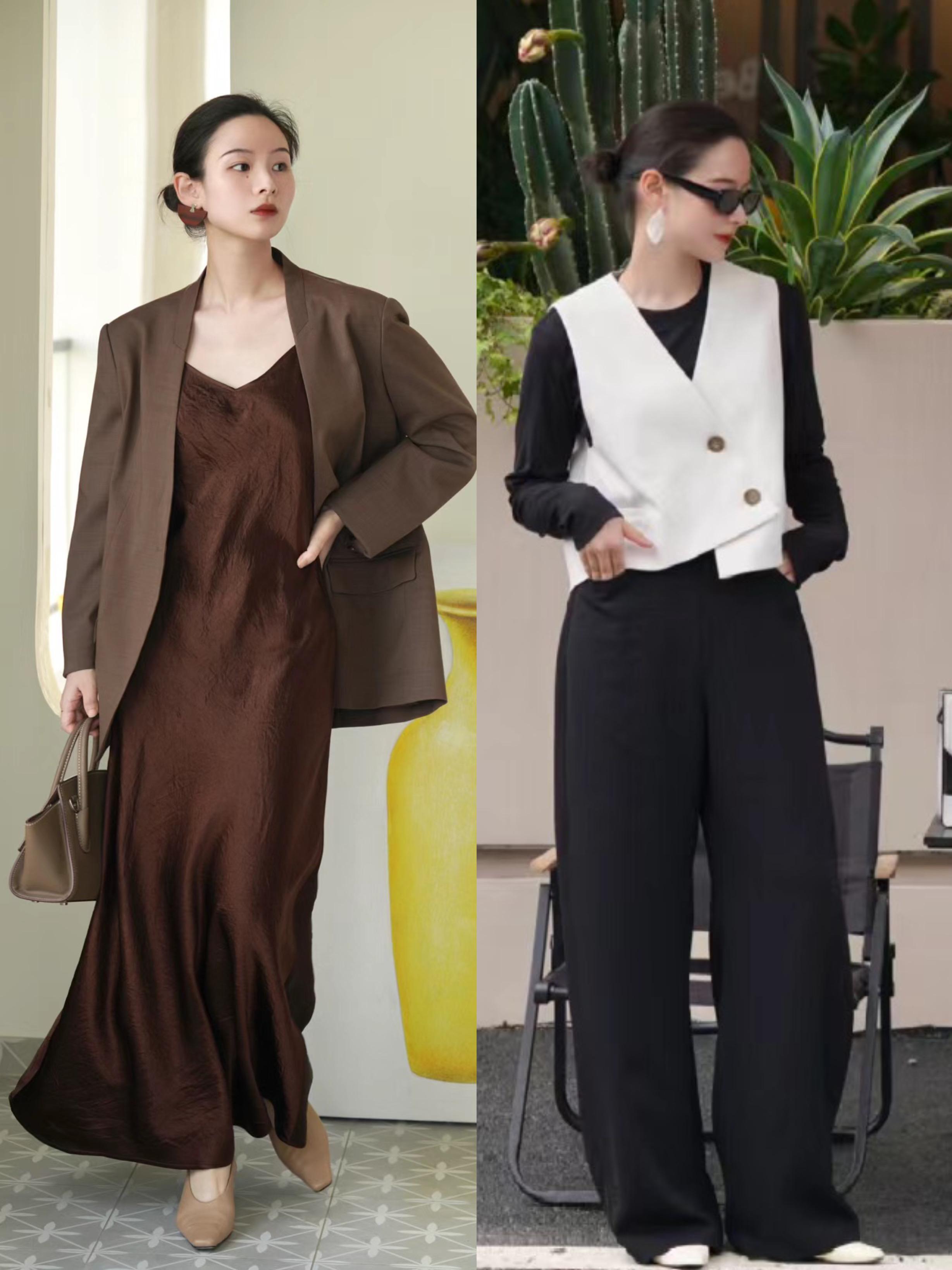 寬鬆的棕色西服外套+同色系醋酸吊帶裙,優雅大方也很顯貴氣。帶着幾分英氣、也不缺少女性的魅感,日常穿着就很有辨識度。