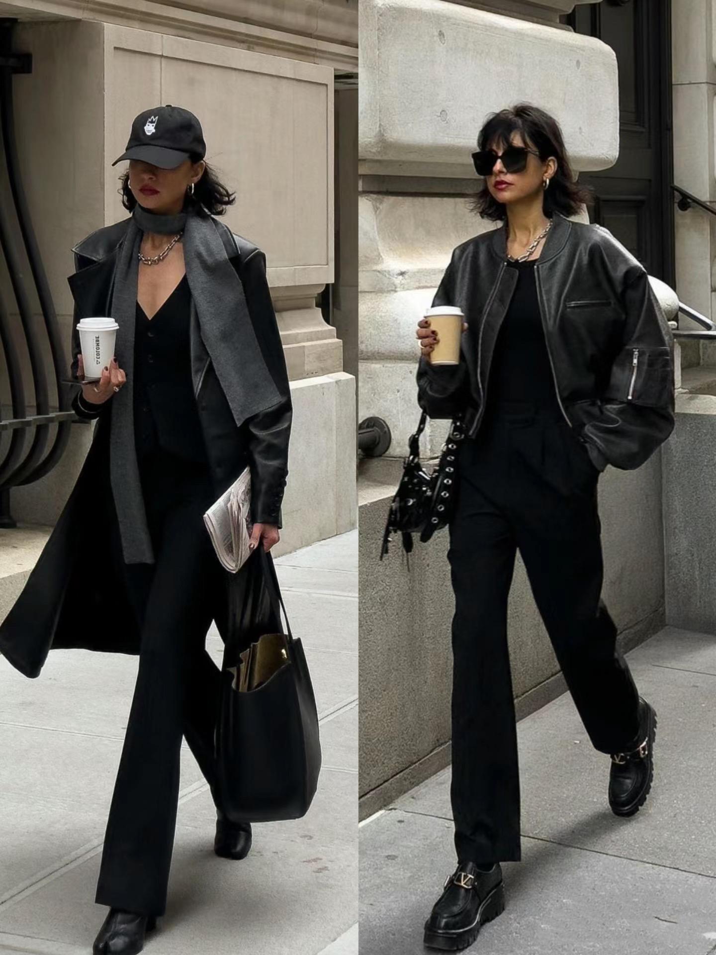 比如黑色皮衣+黑色高腰褲+黑色V領內搭,配上粗獷的項鍊/耳環,不僅辨識度更強,也更加酷颯洋氣。黑色皮衣+黑色高腰褲+黑色厚底皮鞋,又酷又美。