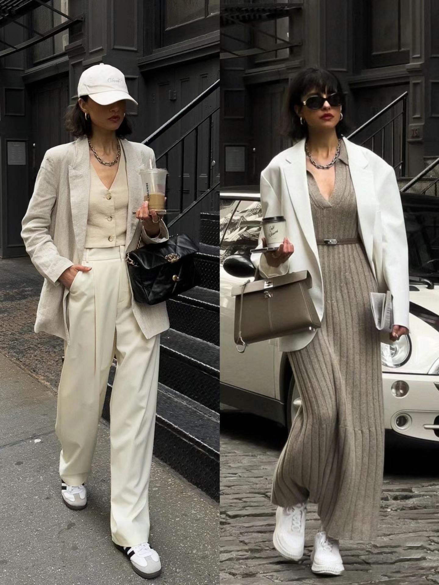 入秋後想要get英氣名媛風,這組穿搭也值得參考。西裝馬甲+闊腿褲的套裝,一身白色清爽醒目,配毛衣大衣好提氣質。