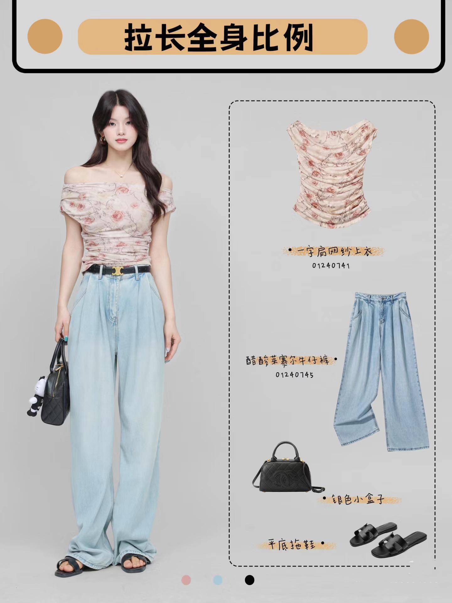 通過通向線條的延伸,不僅可以拉伸腿長、還可以拉伸全身的比例。一字肩的捏褶上衣,垂順的牛仔闊腿褲,簡約又高級。
