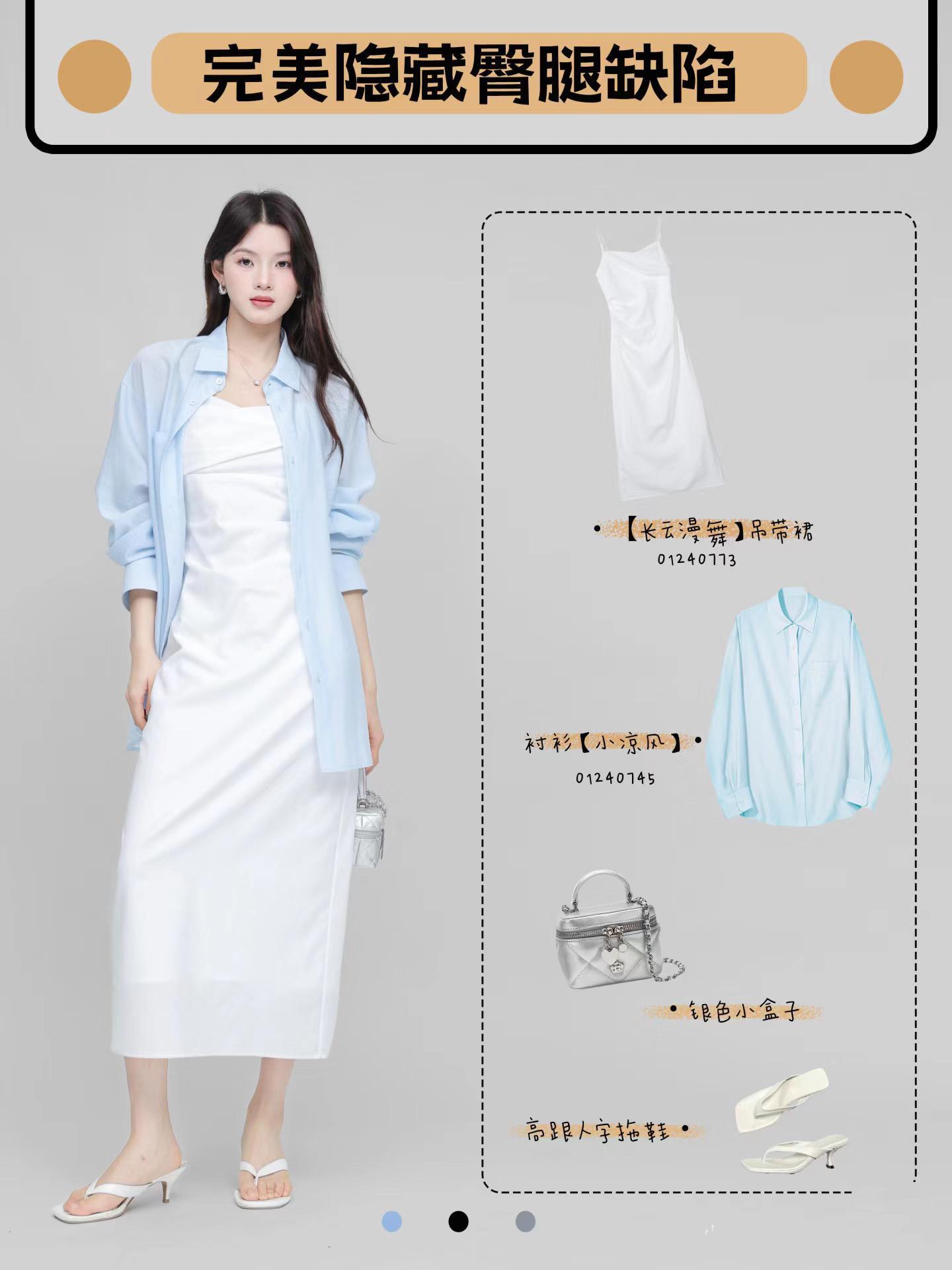 一條修身的捏褶吊帶裙,自然是與寬鬆的淺藍色襯衫更配。淺藍色襯衫作爲開衫穿着,包裹臀部線條、清新溫柔又明媚大方。