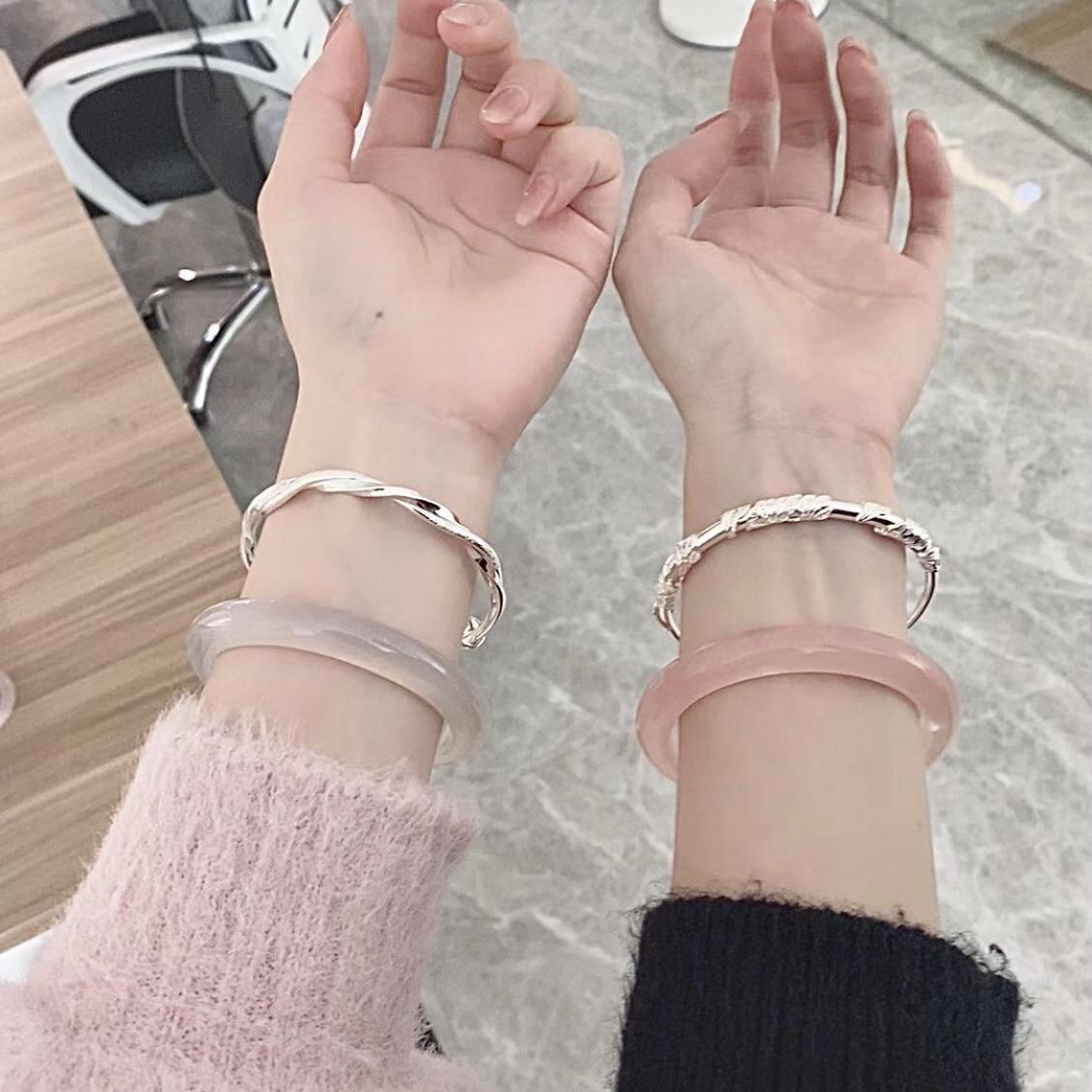 只有款式簡約,克重比較輕的銀手鐲,才適合與玉鐲疊搭。當然這裏也建議大家選擇與便宜點的玉鐲疊搭,只圖好看就行。
