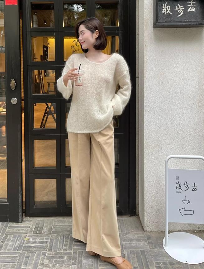 誰能拒絕這麼溫柔的馬海毛毛衣啊,百搭的米白色,加上寬鬆的版型,像這種版型,大多數身材都可以駕馭。選擇一條卡其色的闊腿褲,一身寬鬆,舒適自在又隨性。