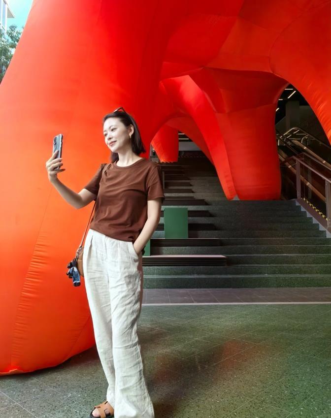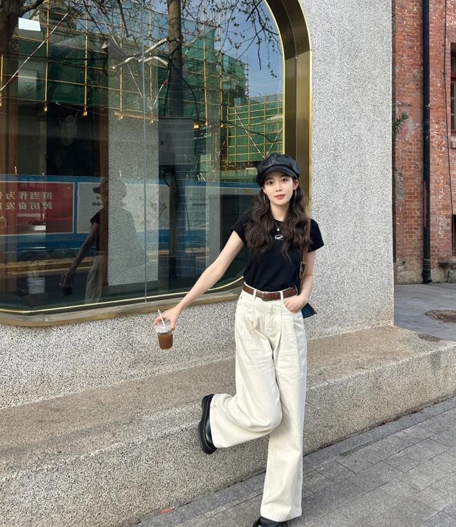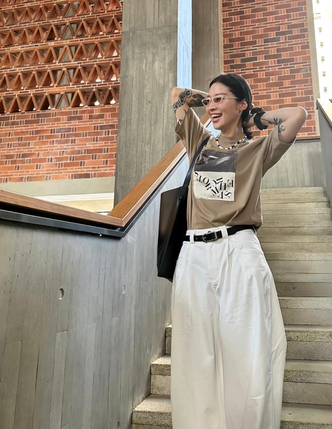 基礎款就是要穿得簡簡單單的纔好啊,黑色短袖t恤+白色牛仔褲,褲子的版型是寬鬆的,那可真的太藏肉顯瘦了,腰間利用起一條棕色的腰帶點綴,不僅提高了身材比例,還能拉長整個身形。