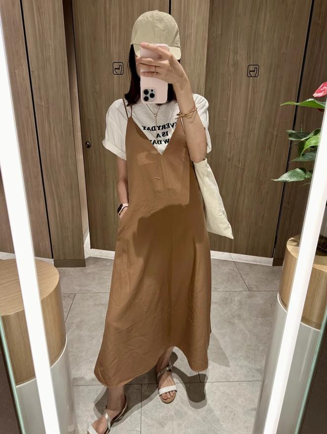 大地色連衣裙,真的是非常顯氣質呢,寬鬆的裙身,給足了身材包容性,無論你是胖還是瘦都可以駕馭。疊穿一件白色的t恤吧,增加層次感,又很減齡。