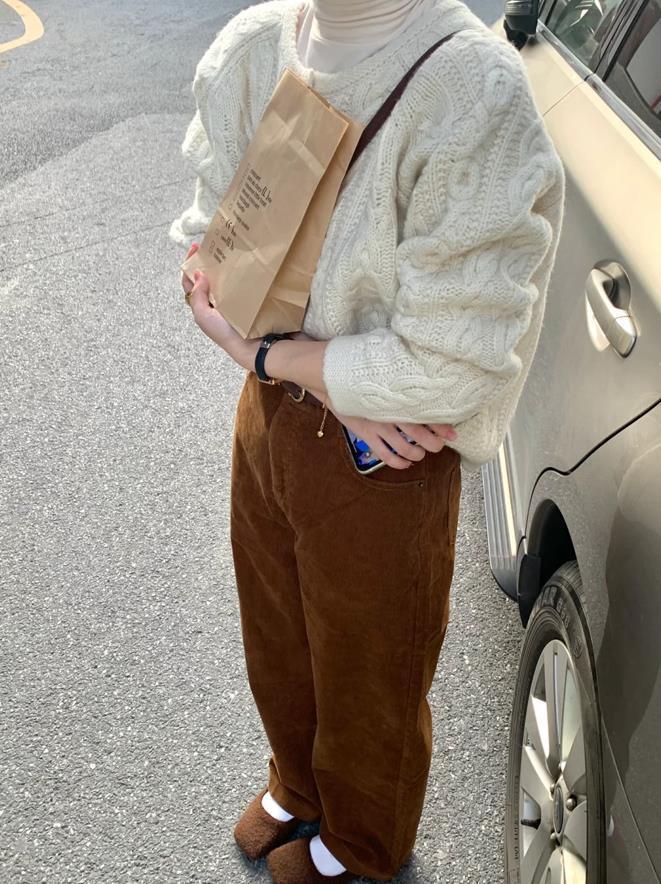 舒適慵懶的一套,看起來也太不錯了,奶白色的麻花毛衣,質感很不錯的款式,細節感也是很強的,與棕色闊腿褲相配,這麼一套看起來也太高級了。