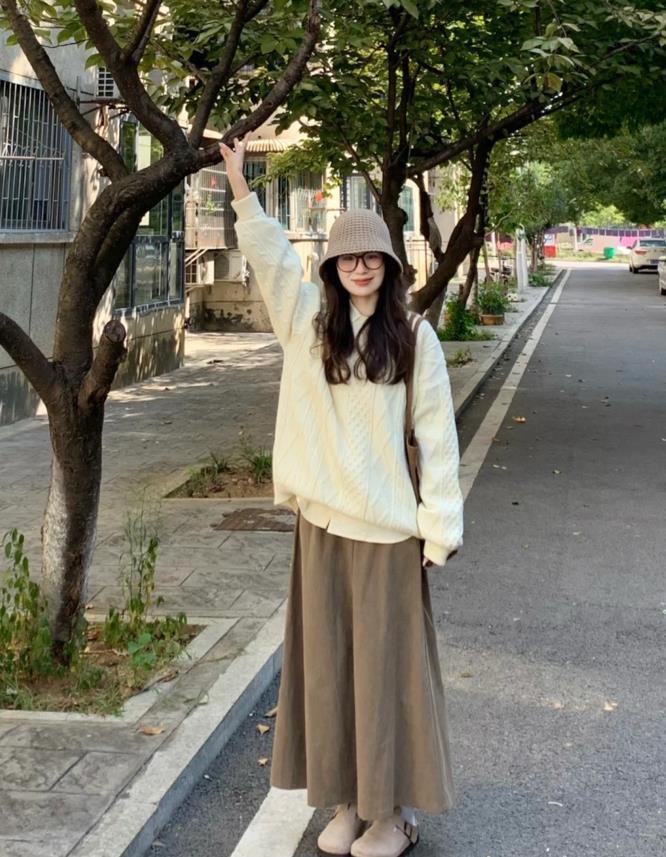 復古韓系風的一套,姐妹們,喜歡這種風格的就學起來吧,米白色麻花毛衣,很喜歡這種寬鬆版型的,可藏肉顯瘦了。與卡其色半身長裙搭配一起,不僅顯溫柔,還帶着滿滿的高級感。