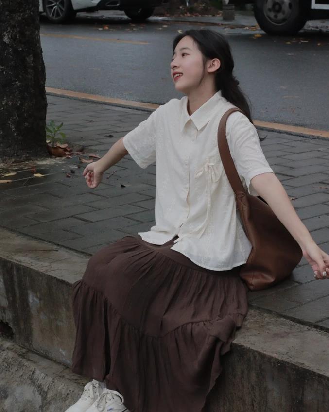 很顯精緻的刺繡復古襯衫,顏色是那種比較溫柔的白色,與咖色的半身長裙搭配,這兩種顏色組合一起,真的太好看了,一整套的版型比較寬鬆,很少女乖巧,上身整個人都很溫柔氣質。