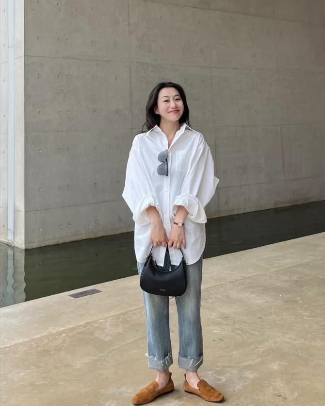 白襯衫+牛仔褲的搭配,真的太時髦簡單了,寬鬆的襯衫版型,給足了身材包容性,也顯瘦休閒,直筒的牛仔褲,可以把雙腿比例襯托得很直和修長,鞋子搭配了一雙棕色的樂福鞋,舒適自在又好看。