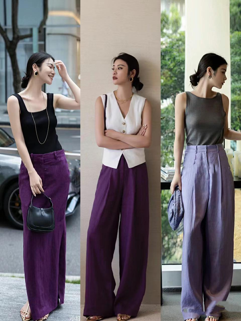 深紫色的濃郁與貴氣,似乎是與生俱來的。不管是半身裙、闊腿褲、還是連衣裙,都可以搭配濃郁高貴的紫色。