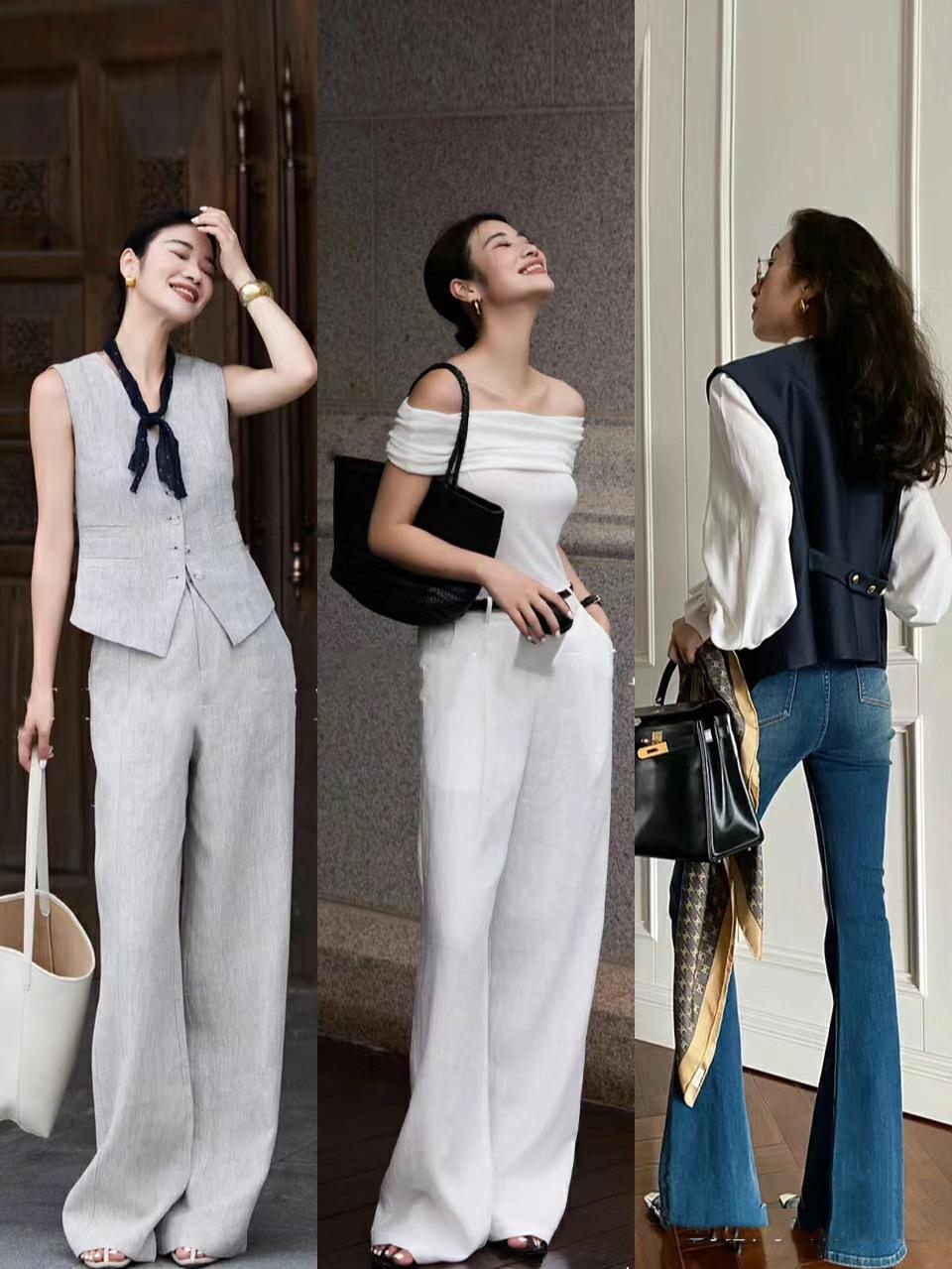 淺灰色的套裝,色調柔和、簡約體面。以合身的背心馬甲+同款的高腰褲,配上小絲巾修飾,是簡約到極致的美,淺灰色不挑膚色,亮度更高、也更顯白一些。