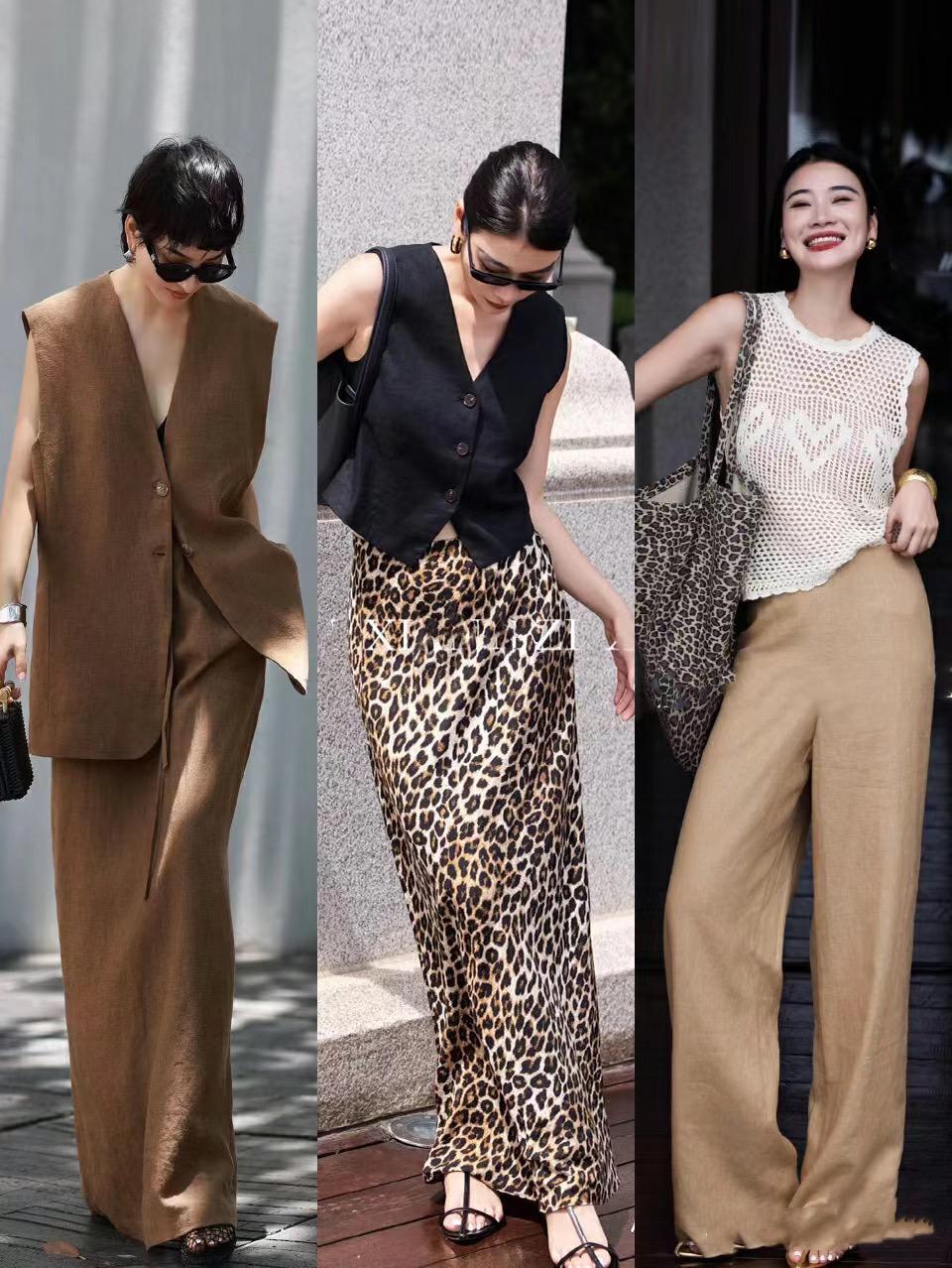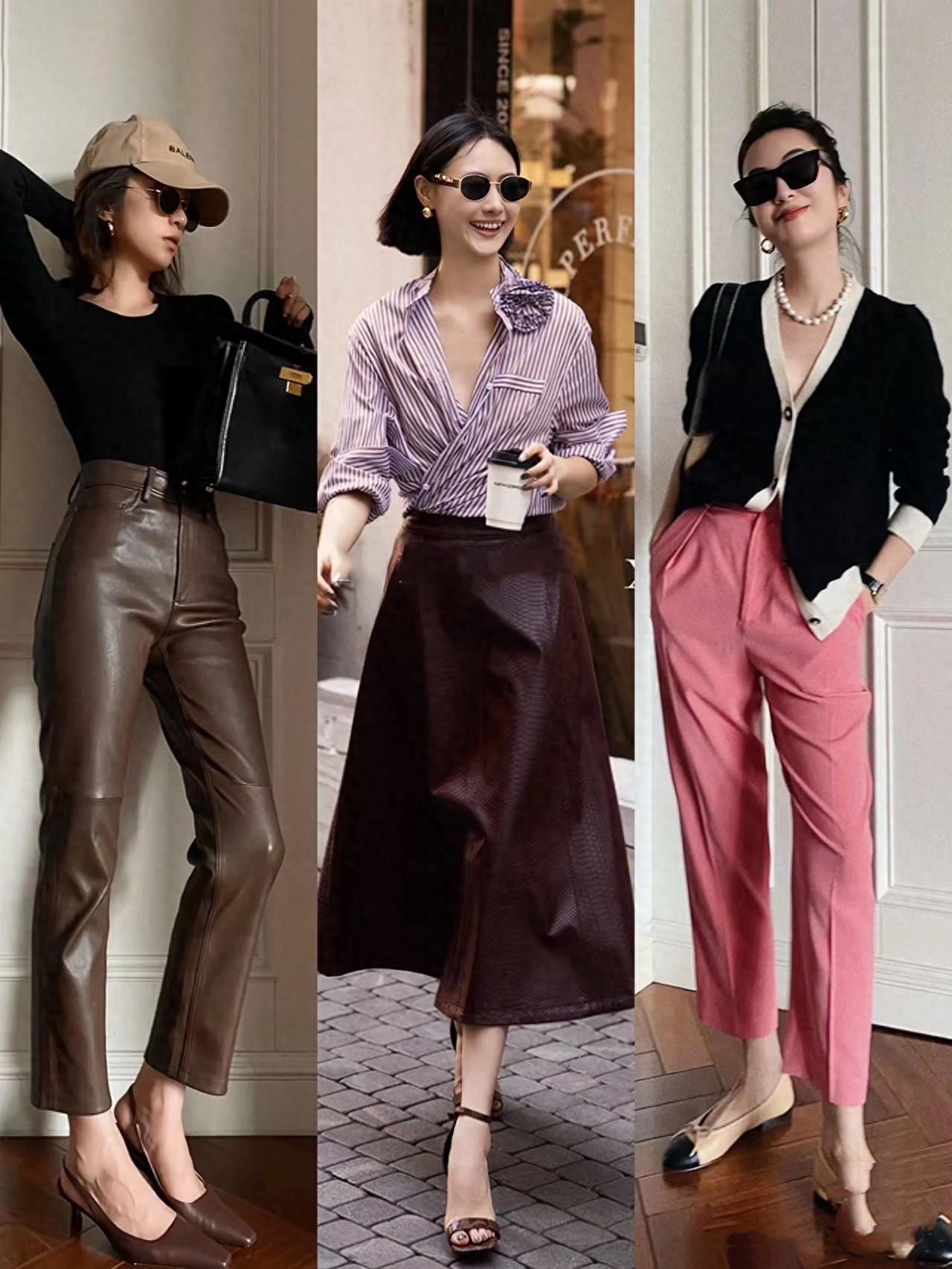 寬鬆條紋襯衫、黑白撞色的針織馬甲、緊身的針織衫,不管是配錐形褲、直筒皮褲、還是挺闊的A字形半身裙,都颯美高級。
