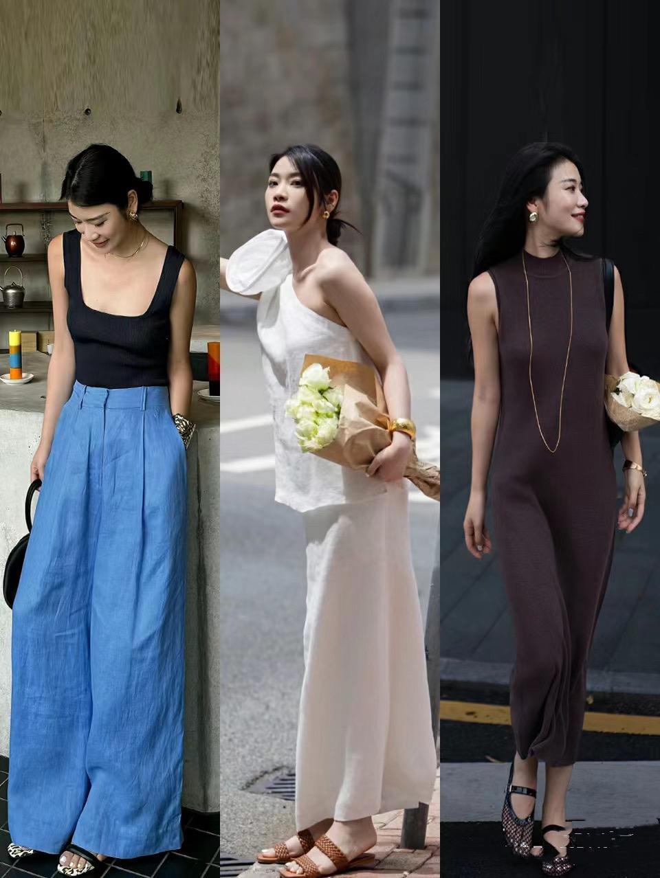 大領口的吊帶背心,可以配高腰的藍色闊腿褲。上窄下寬的設計,藍黑配色也是乾淨高級。黑色小背心,大領口設計也很顯瘦。