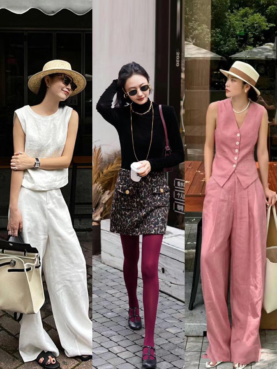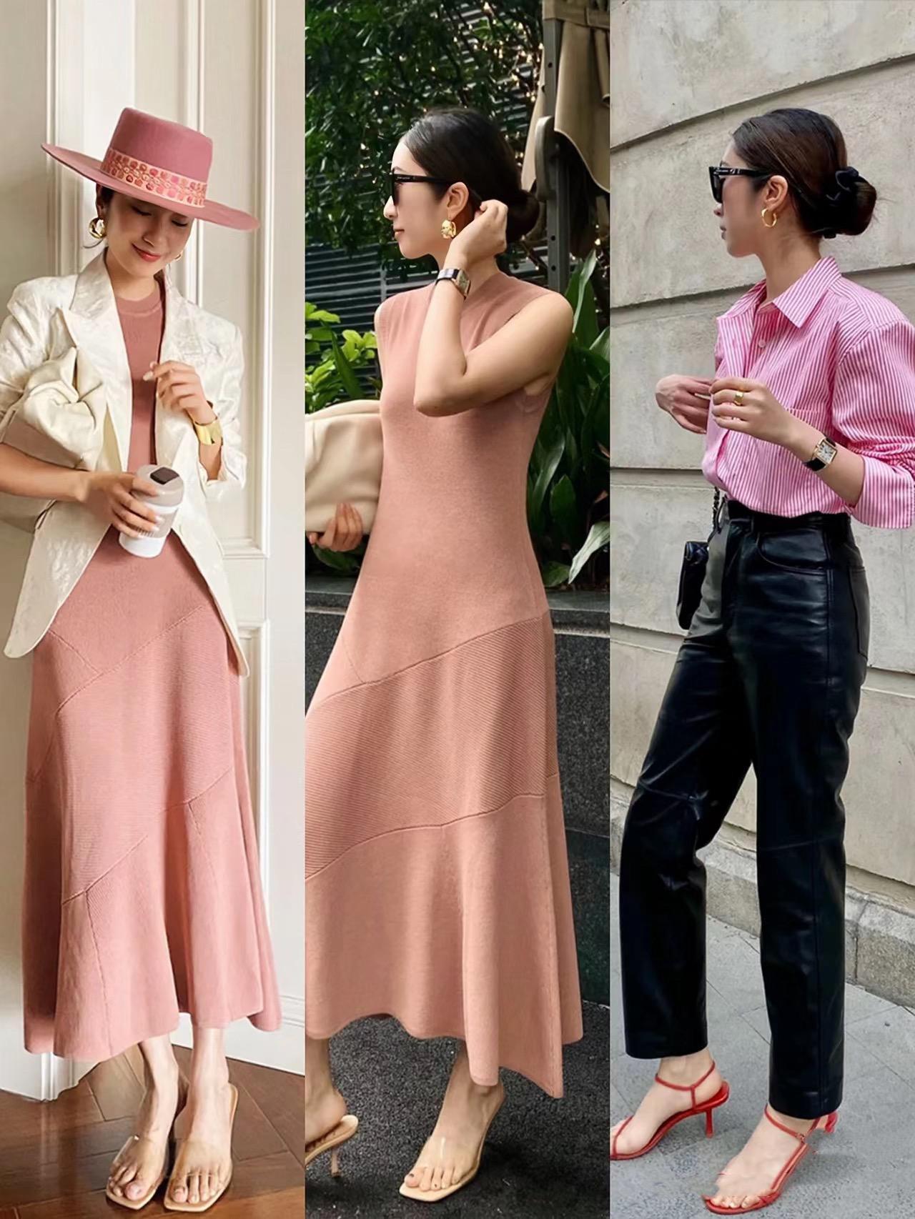 比如粉色系的套裝,書寫着簡約又高級的美。粉色馬甲+闊腿褲的套裝,配珍珠項鍊、小禮帽,也是更高級雅緻的。
