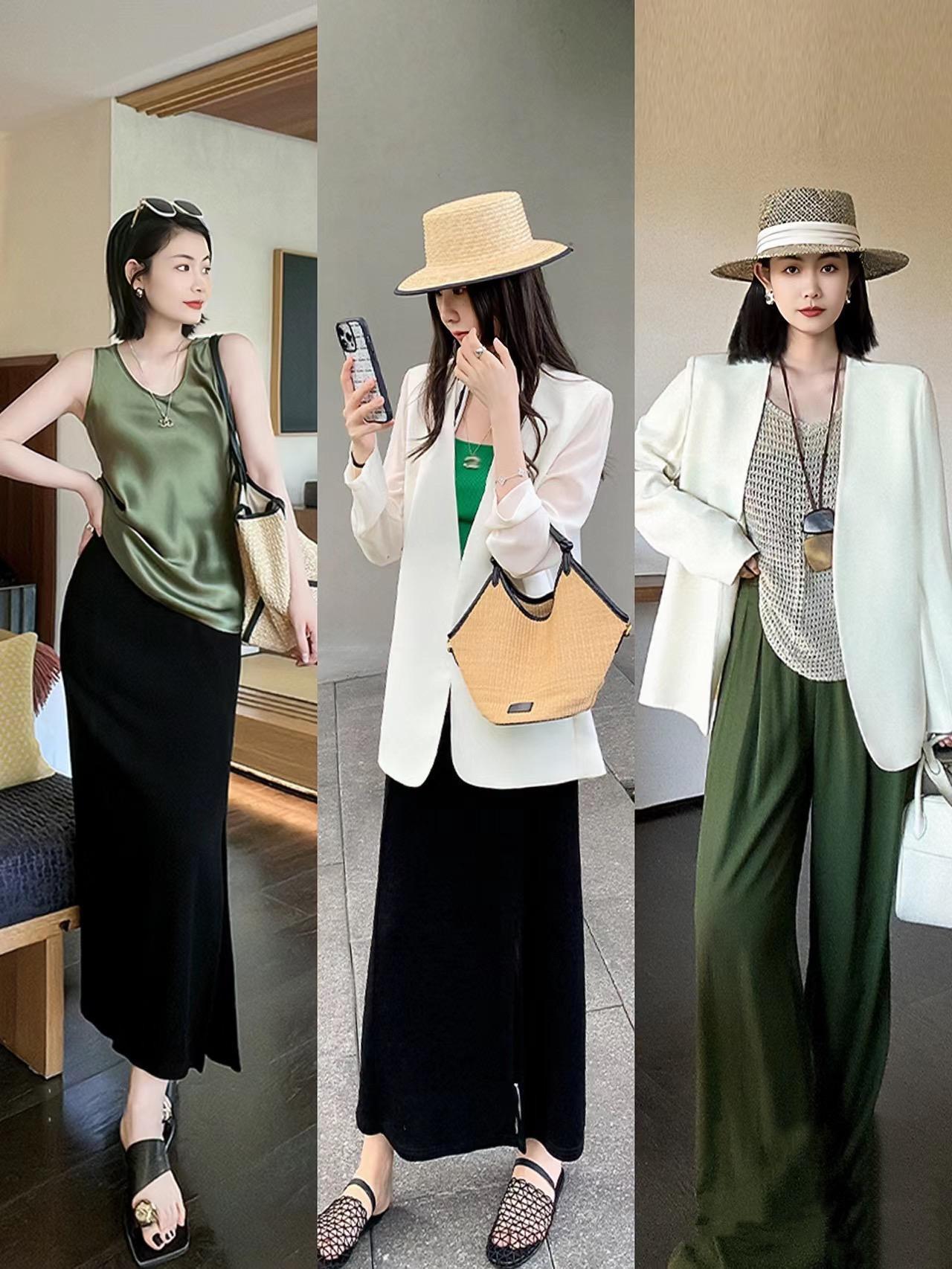 牛油果綠的闊腿褲,與鏤空的背心、白色西服外套也很配。綠白配色乾淨美好,尤其是白色西服外套,簡單大方、書寫着時尚氛圍。