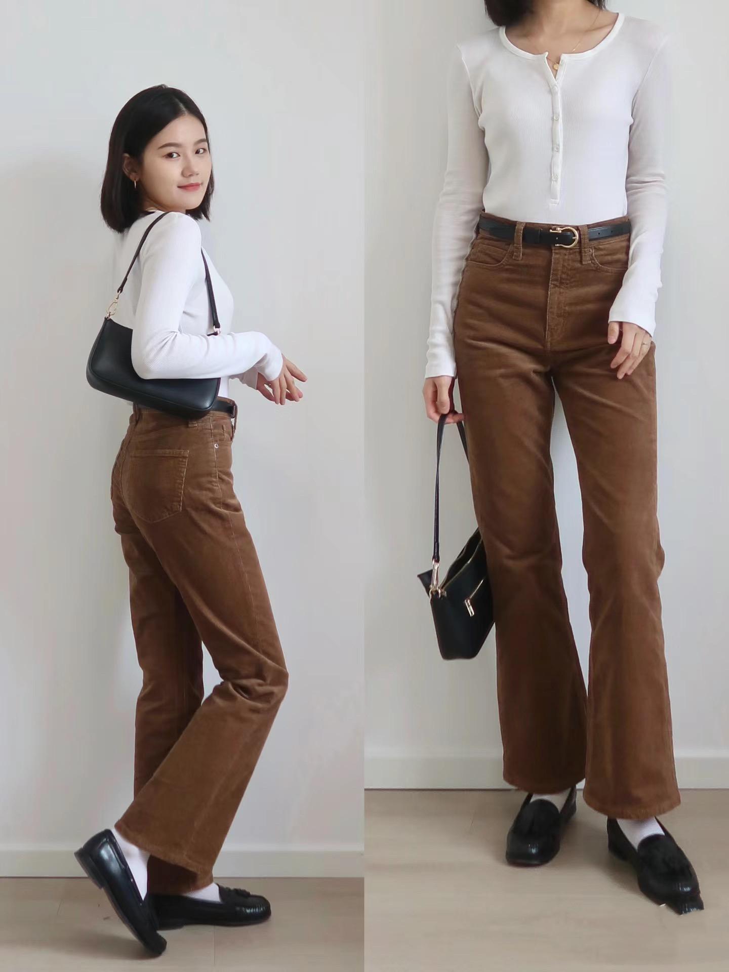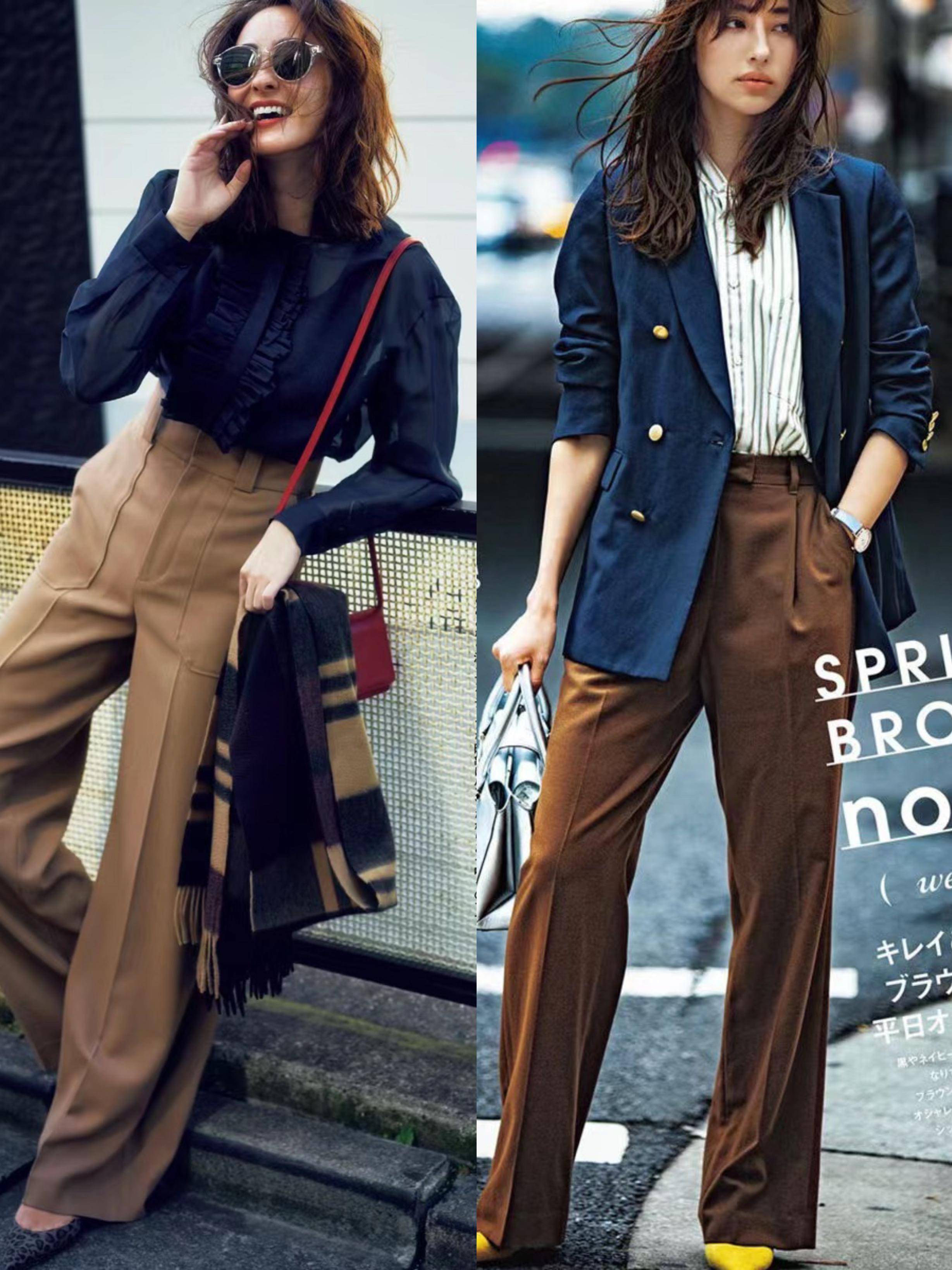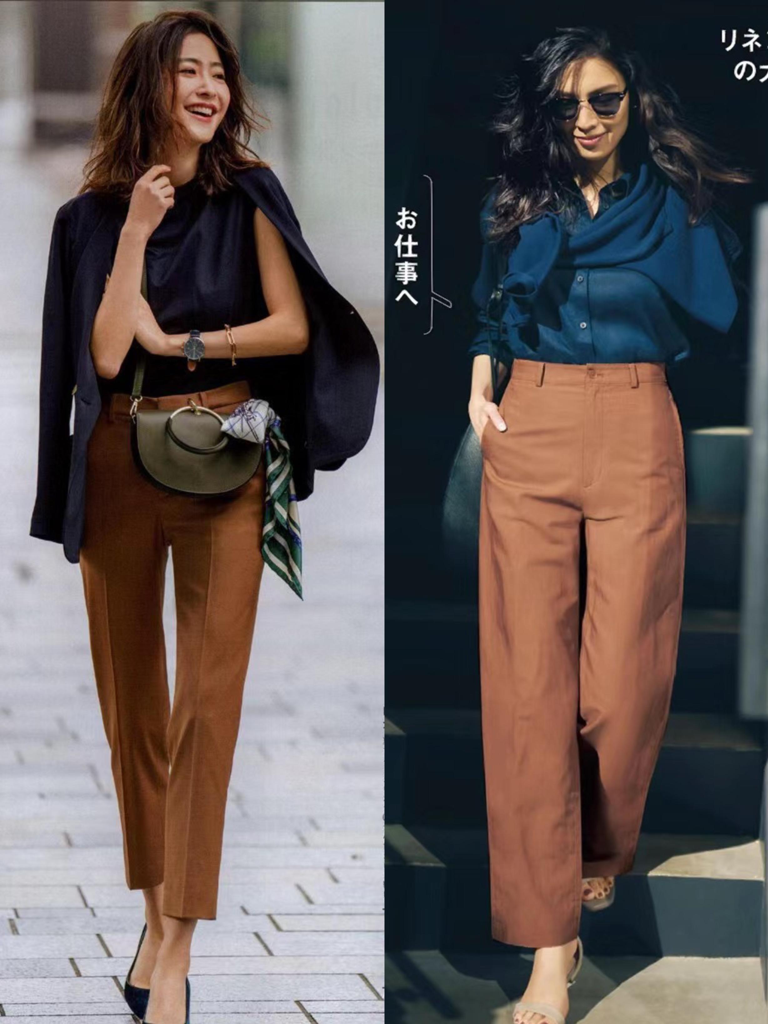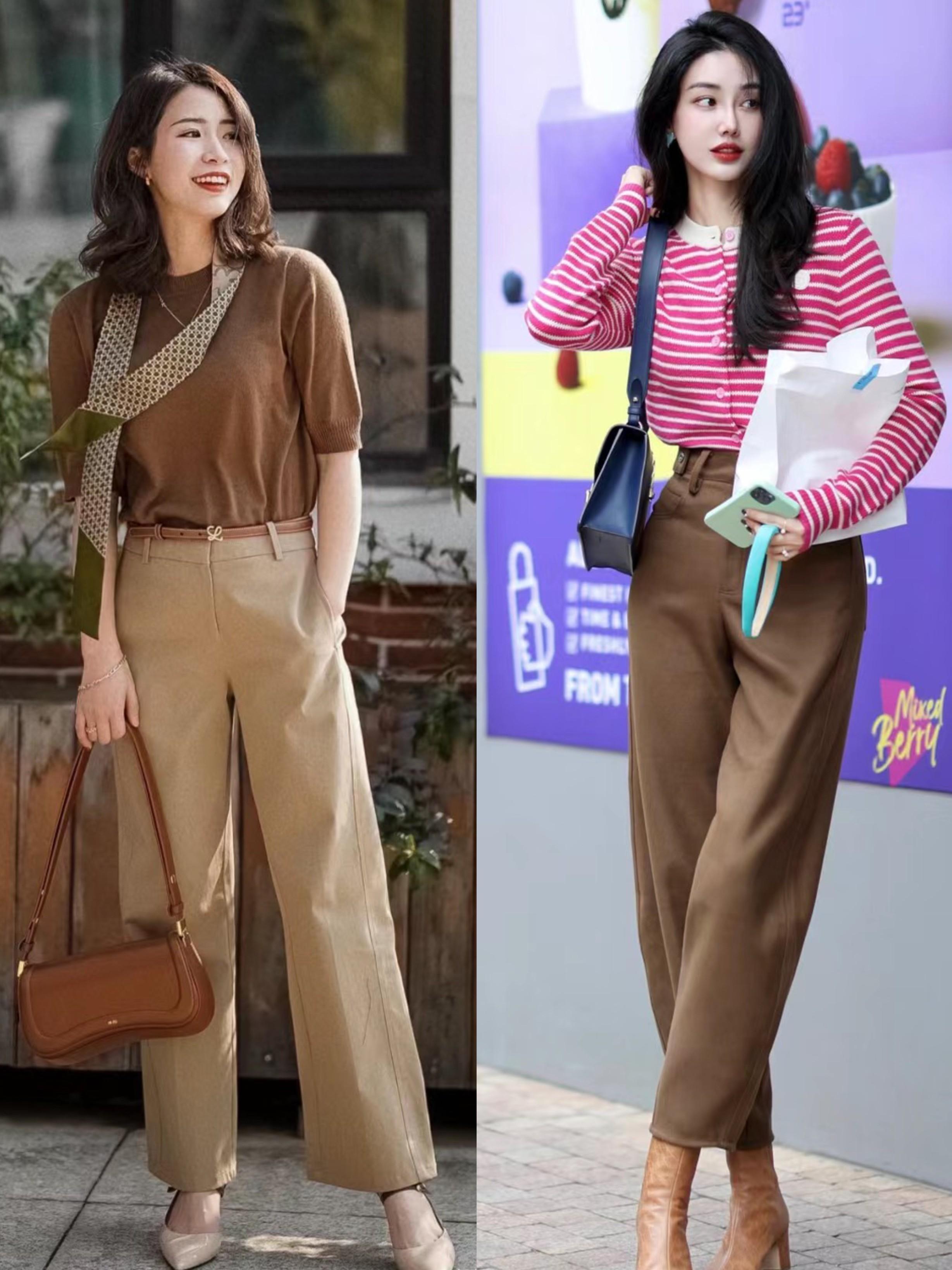 一條咖色褲子,比常規的牛仔褲、小黑褲更時髦。色彩屬性上也屬於典型的高級色,給我們的穿搭增彩,讓氣質更高級。