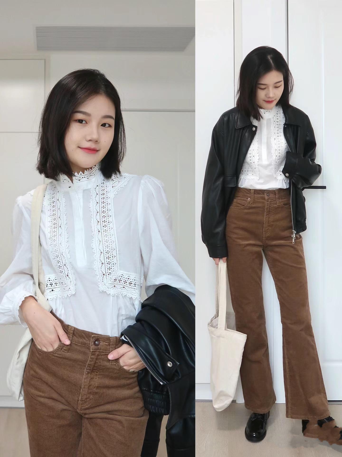 宮廷風白襯衫,配高腰的棕色褲子,簡約中帶着貴氣。白襯衫疊搭白色皮衣外套,酷颯之感溢於言表。這種簡單又時髦的穿搭,也更惹眼。
