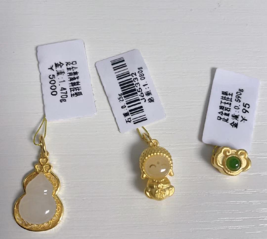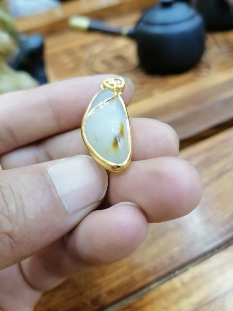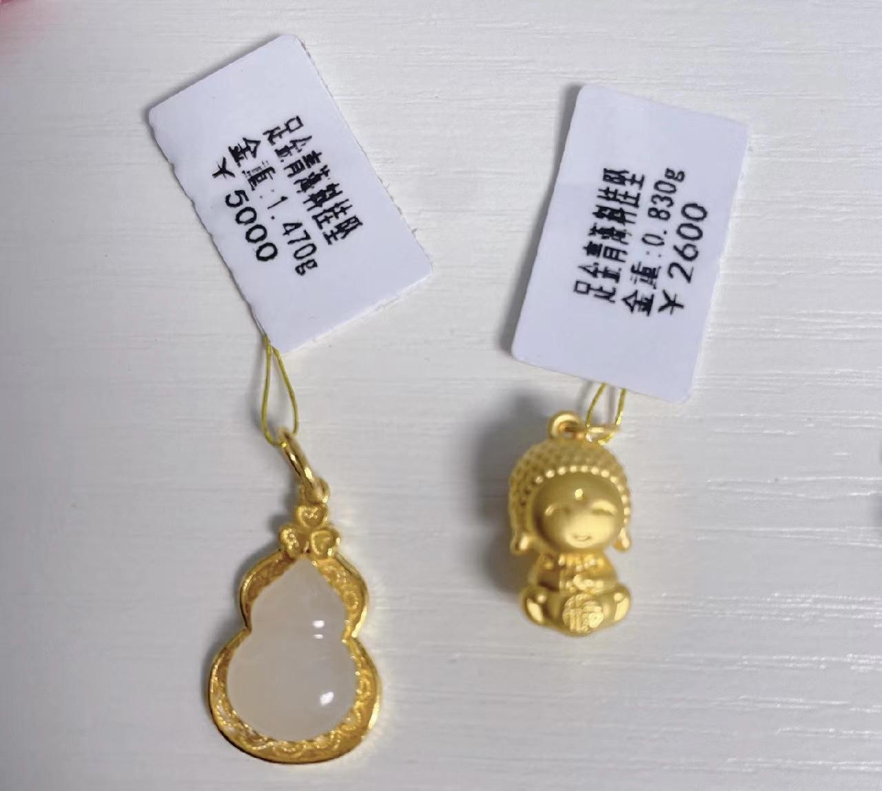 這種金鑲玉,其實就是金箔包玉。金箔主要包裹在邊緣、或者玉石的底部,看起來薄薄的一層。但這種金箔,含金量是非常低的,成本也就在0.1-0.2g之間。